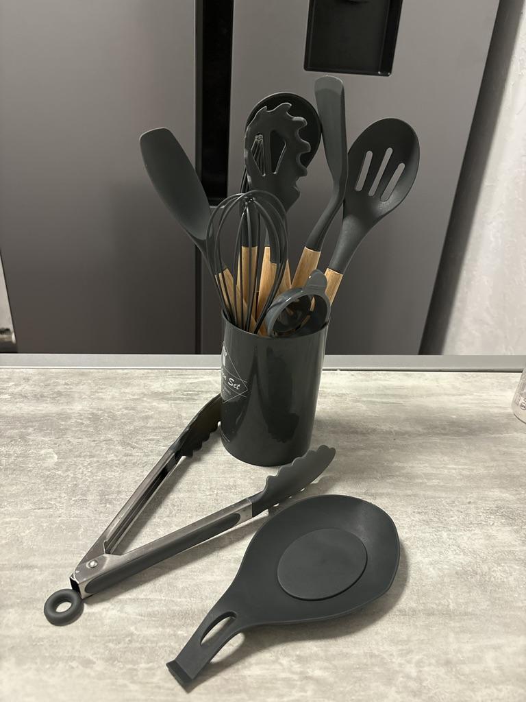Хороший набор, качественный. Деревянная ручка, а все остальное сделано из пластика, края силиконовые, что очень удобно при помешивании. Подставка для ложек полностью силиконовая. В наборе много элементов повторяющихся, половину отложили, половиной будем пользоваться сразу.