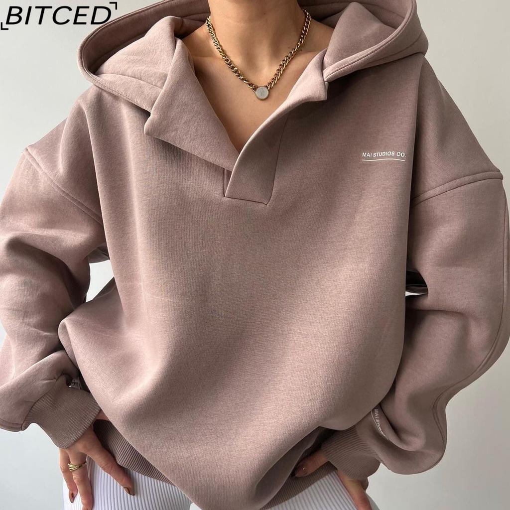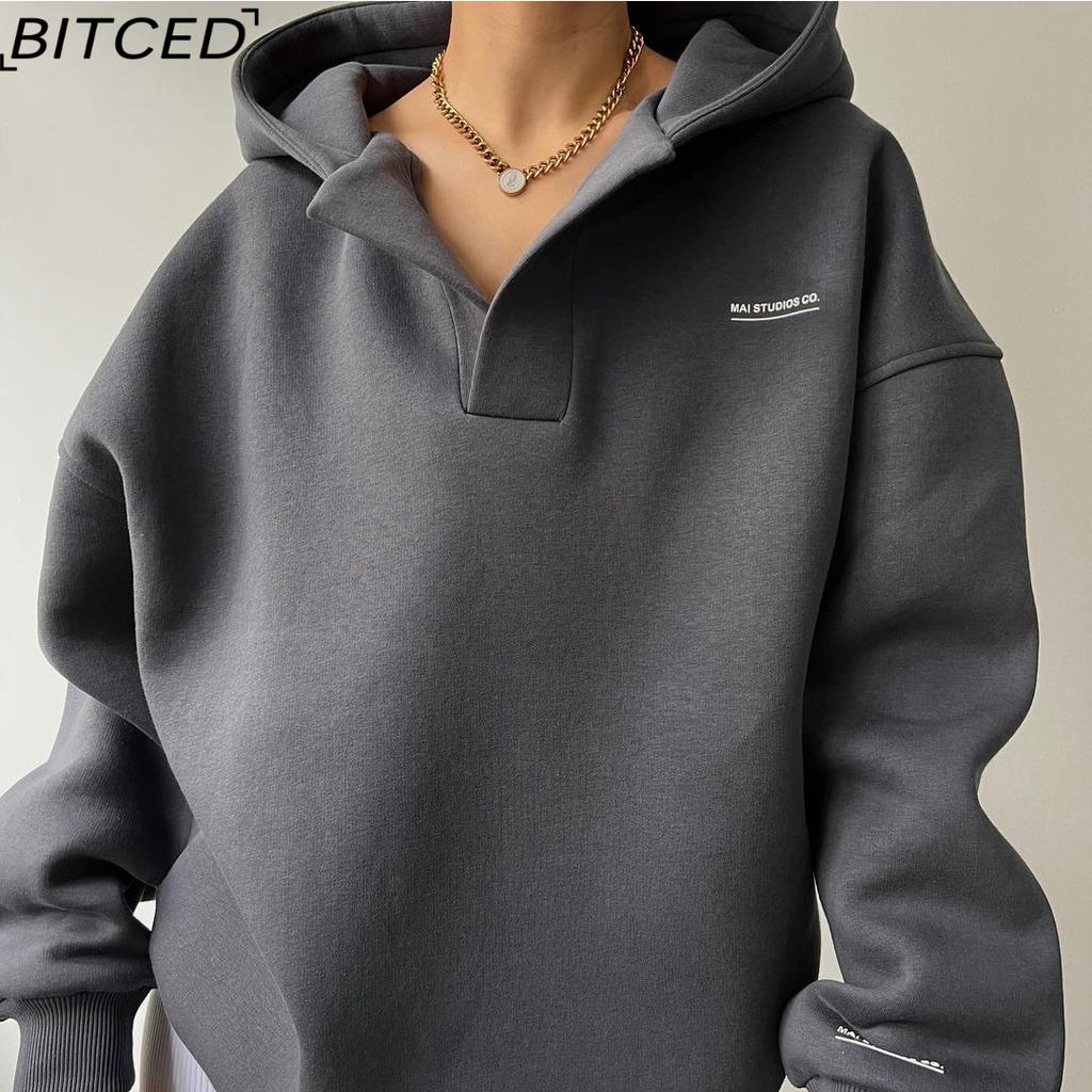 BITCED Базовая универсальная толстовка с капюшоном из флиса и принтом, с длинными рукавами и флисовой рубашкой с V-образным вырезом