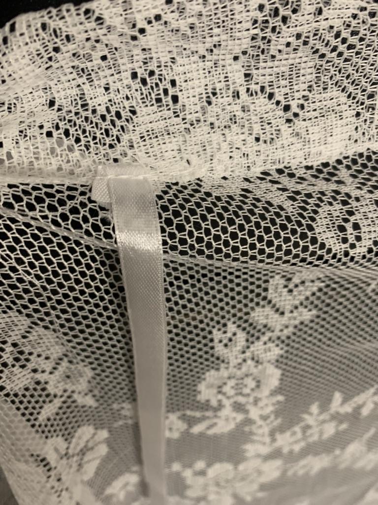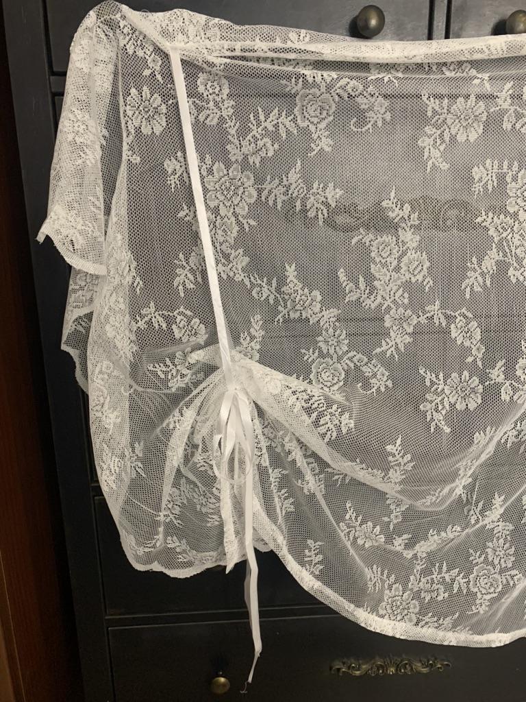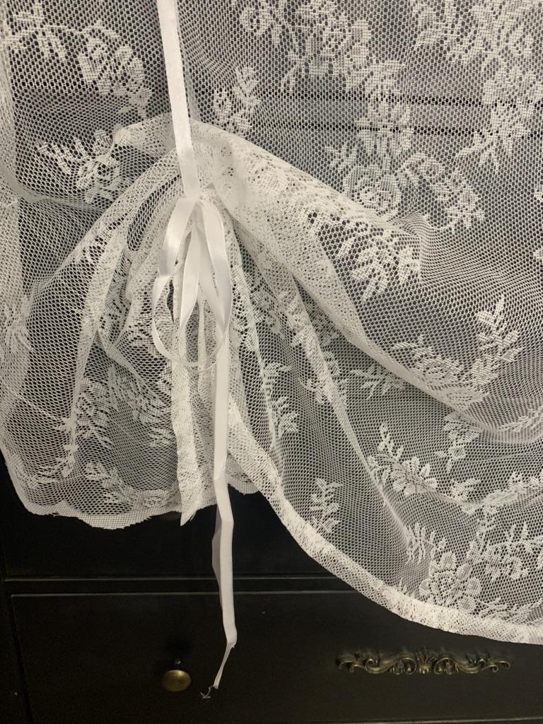 Тюль на небольшое окошко Дачный вариант Задумка хорошая, исполнение хромает Сверху кулиска Фестоны только по бокам С двух сторон пришиты куски атласной ленточки Типа для подвязывания Края лент никак не обработаны, надо прижечь Но ровно и красиво сделать сложно Здесь тоже лучше кулиску и стянуть А так конструкция очень нестандартная Нужно доработать Ну а так симпатичная