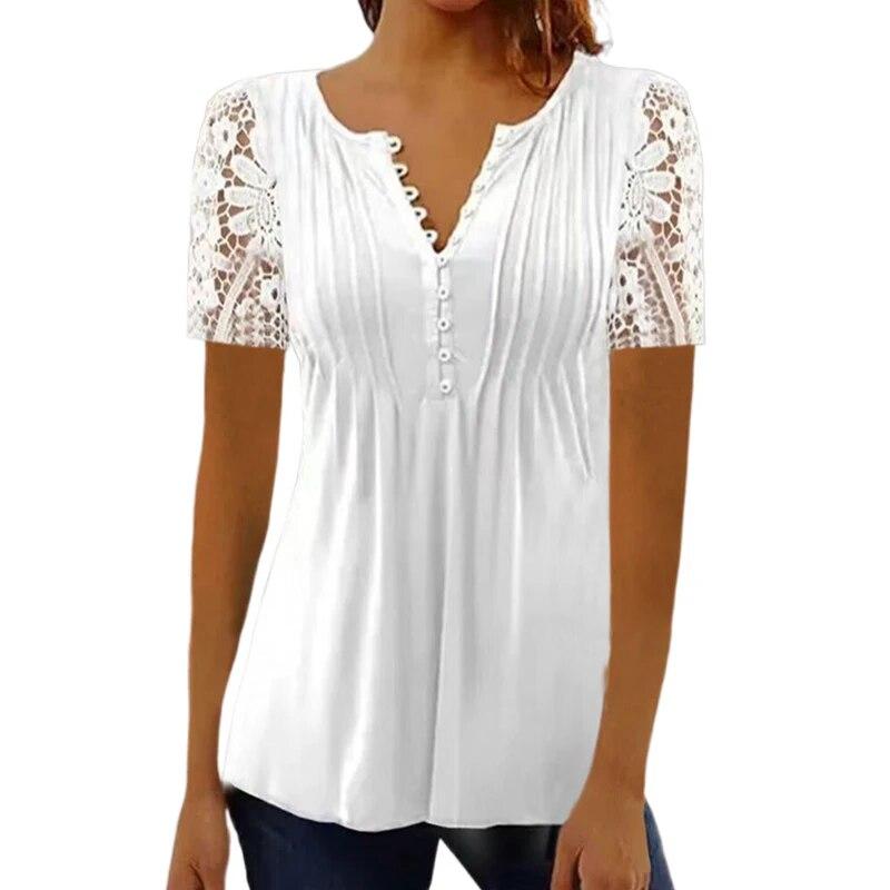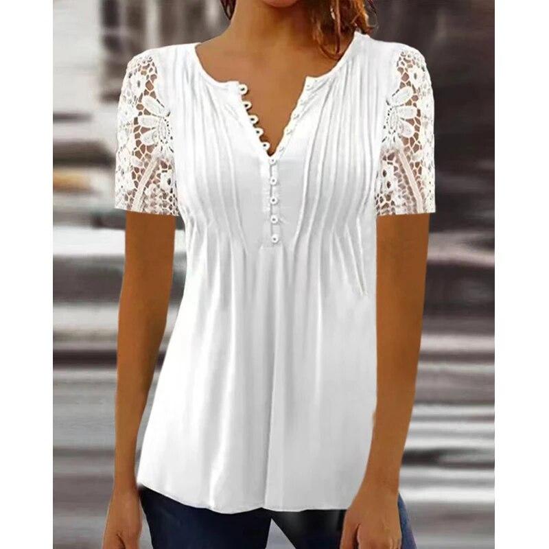 2024 Женская кружевная блузка с коротким рукавом и пуговицами, модные ажурные вязаные крючком рубашки, женские плиссированные топы, Blusas Mujer 30666