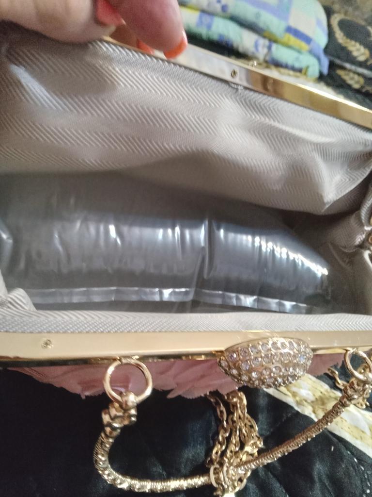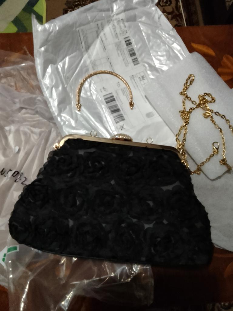 Сумочка не плохая, присутствует не приятный запах. Мне не понравилось, что ручка отдельная и отогнутые кольца (на них крепятся ручка и цепочка). Цепочка хорошая, крепкая на карабинах, у замка шляпка красивая в стразах, но сам замок слабый (не знаю как будет держать) . Также не очень понравилось, что украшения из капрона по всей сумке не равномерна много голых мест. На чёрном фоне это выделяется, ткань- капрона сильно натянуто и цветы смотряться не пышно. Но я это конечно своей фантазией исправлю (меня в таких случаях пойетки спасают), где голые места украшу. Сумочку рекомендую, вместительная, просто оформлена на скорую руку, я считаю что так нельзя... , что-бы покупатель потом дорабатывал изделие. Заказывала под определённый наряд. Продавцу большое спасибо за быструю доставку и хорошую упаковку!