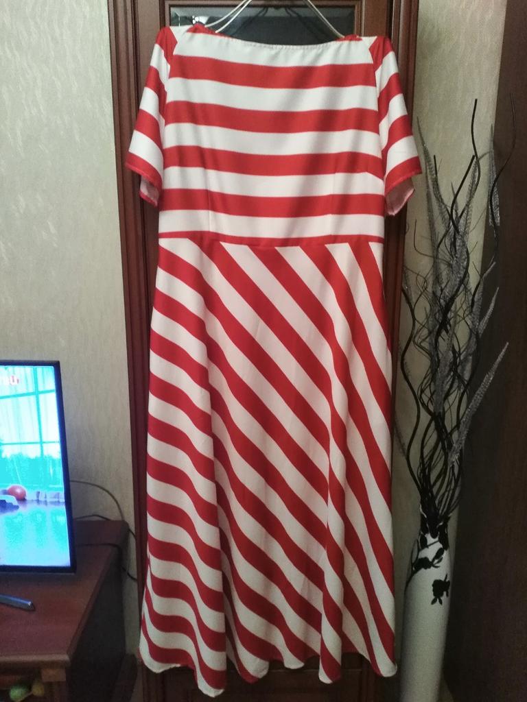 Не знаю, откуда тут столько хвалебных отзывов, может лучше не видели, но я платьем полностью разочарована. Материал дерюга какая то, толстенное, этот типа "шелк" аж колом стоит, не дышит абсолютно, в жару в нем в обморок свалиться можно. Полоски не красные алые, а как в терракот немного, красный с рыжинкой, не красиво(. Думаю, с синими лучше. Спереди еще и пятно какое то на платье, придётся сразу стирать. На рос.52-54 размер 5хл как раз, без обтягов, вверху у меня рос. 50- слегка великовато. На рост 169 см почти до пят, см 2 не хватает. Талии как то завышена. Возможно, подберу пояс. Но в целом разочарована (качеством ткани и расцветкой полоски)