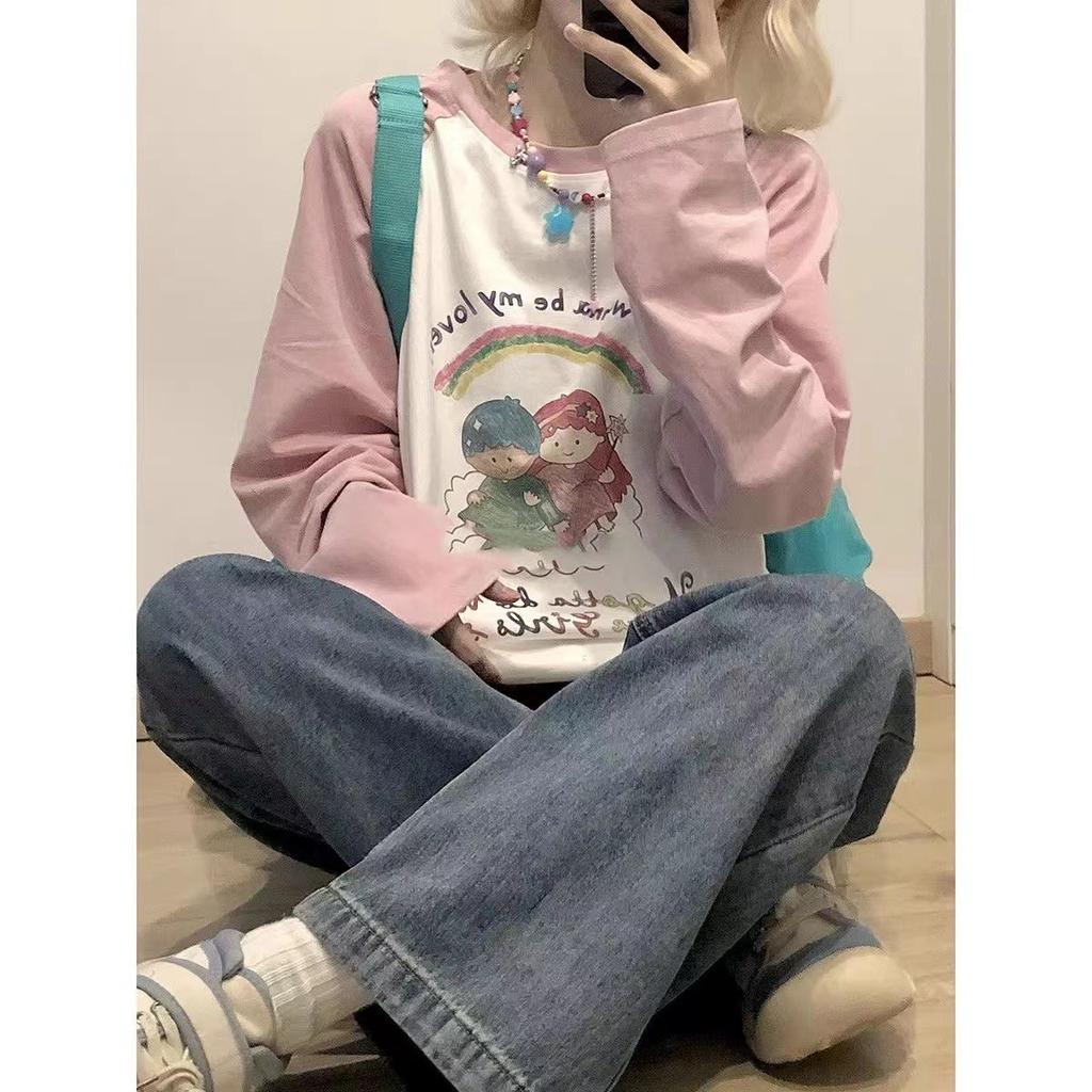 Футболка, одежда с длинными рукавами, женская милая футболка с длинными рукавами и радужным принтом, Y2k, свободные повседневные контрастные футболки для девочек, топы