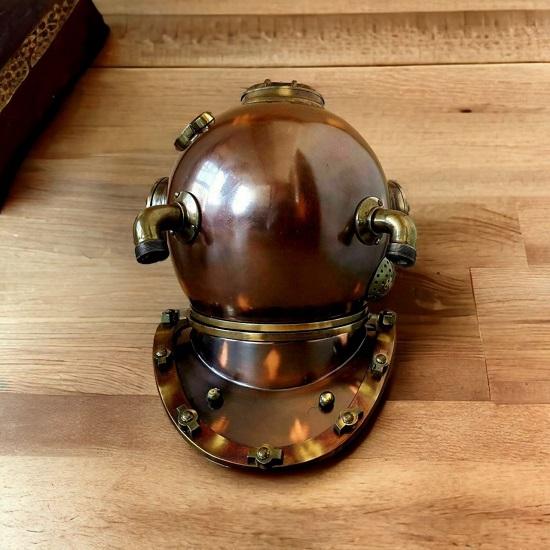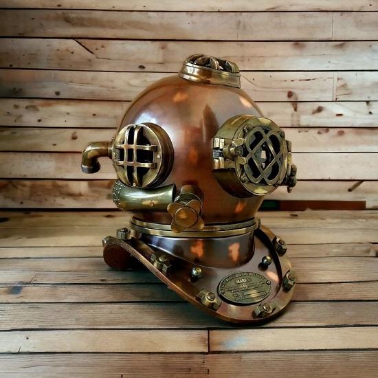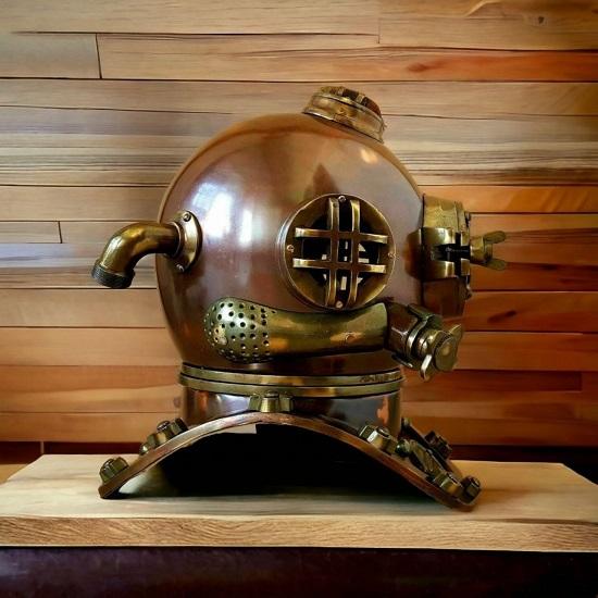 Изготовленный из высококачественного металла, шлем имеет насыщенную коричневую металлическую отделку, которая не только добавляет нотку элегантности, но и отражает суровый дух глубоководных дайвинг-приключений.. Замысловатые детали шлема демонстрируют мастерство наших опытных мастеров, делая его аутентичным и привлекательным дополнением любого пространства.