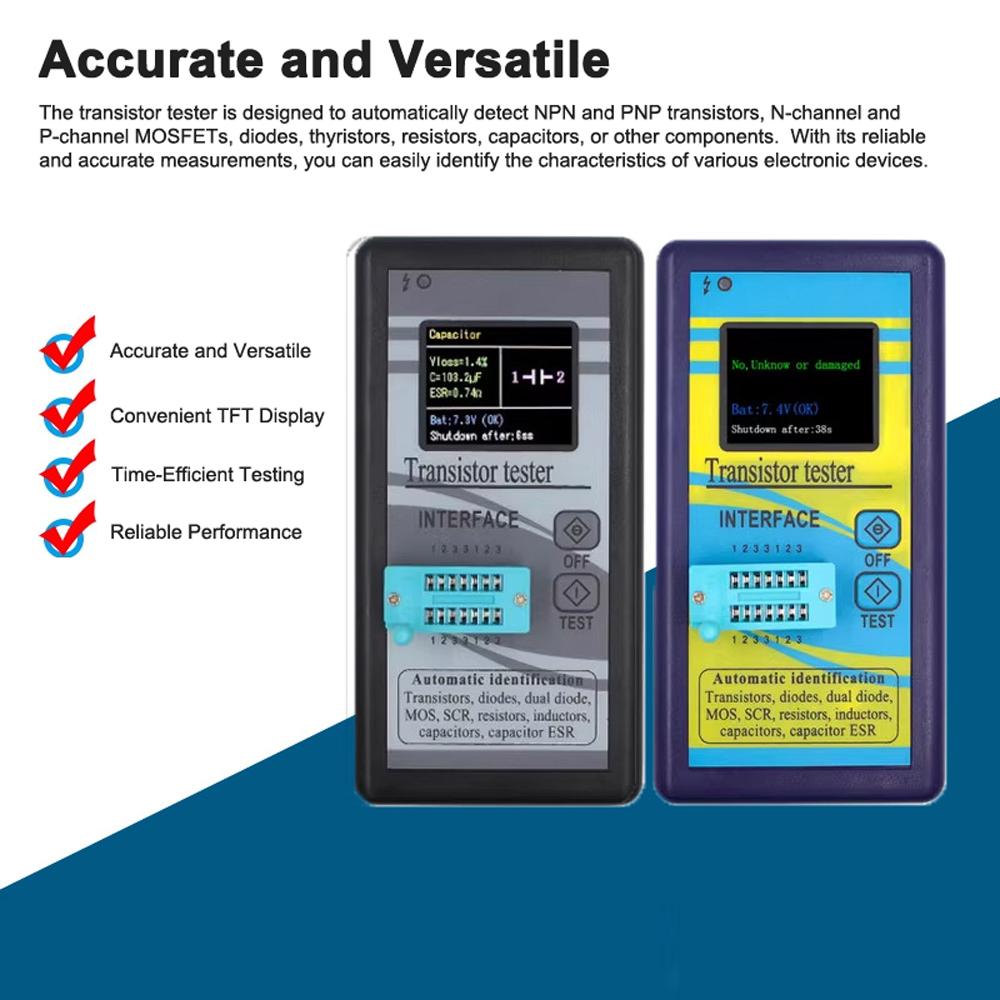 Точный и универсальный: Тестер транзисторов предназначен для автоматического обнаружения транзисторов NPN и PNP, N-канальных и P-канальных МОП-транзисторов, диодов, тиристоров, резисторов, конденсаторов или других компонентов.. Благодаря надежным и точным измерениям вы можете легко определить характеристики различных электронных устройств.