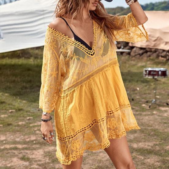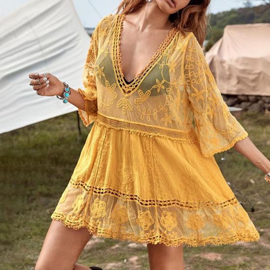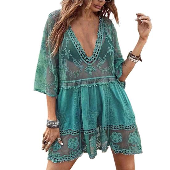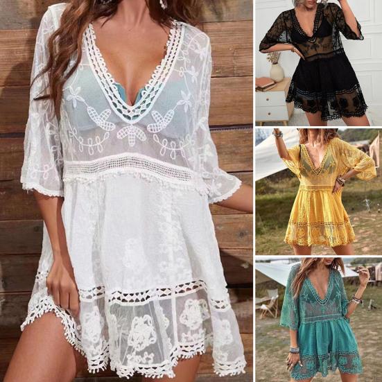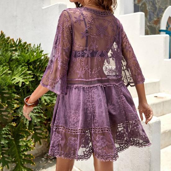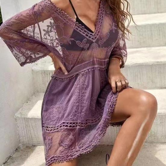 Прозрачная накидка с v-образным вырезом и половиной рукава, вязаный крючком кружевной купальник, накидка