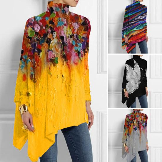 Представляем нашу стильную и универсальную женскую футболку с высоким воротником и нерегулярным подолом! Этот модный топ с высоким воротником, длинными рукавами и свободным кроем обеспечивает максимальный комфорт.. Модный принт и дизайн средней длины придадут индивидуальность любому наряду..