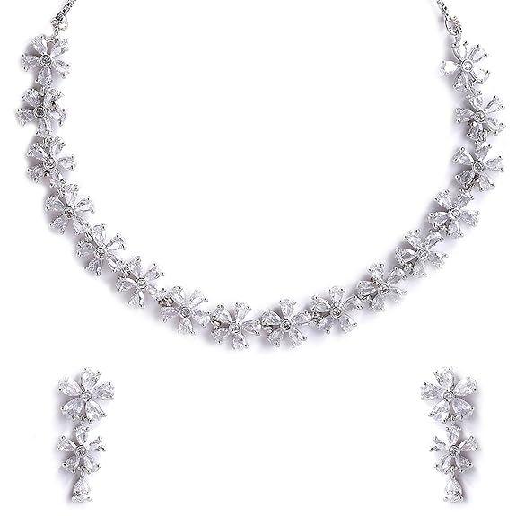 Что вы получаете:- Ожерелье в форме цветка с американскими бриллиантами и родиевым покрытием серебряного тона и 2N (1 пара) Серьги