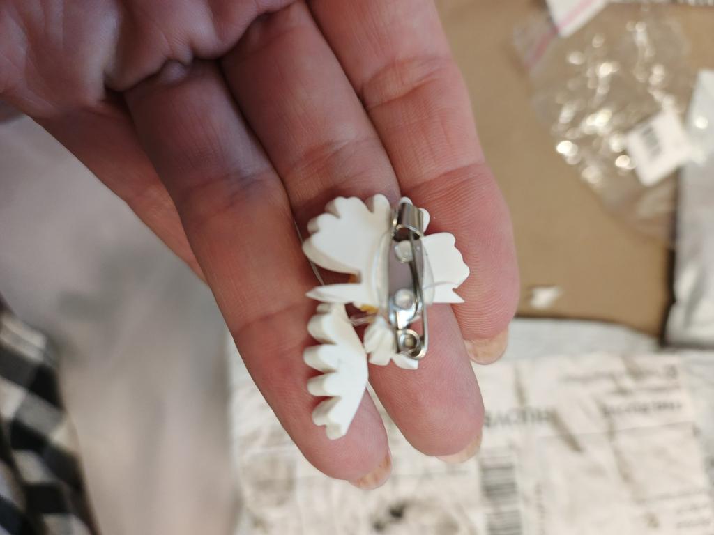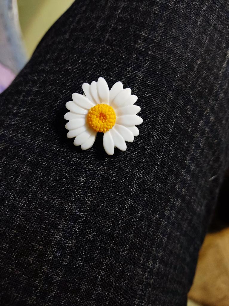 Всё искала замену потерянной пуговице на кофте,заказывала разные брошечки-прищепочки. Пожалуй,на этой остановлюсь. Сзади булавочка прилеплена на смоляные "плюшки". Надеюсь,не как основное крепление,а как дополнительное. Миленькая ромашка нужного мне маленького размера.