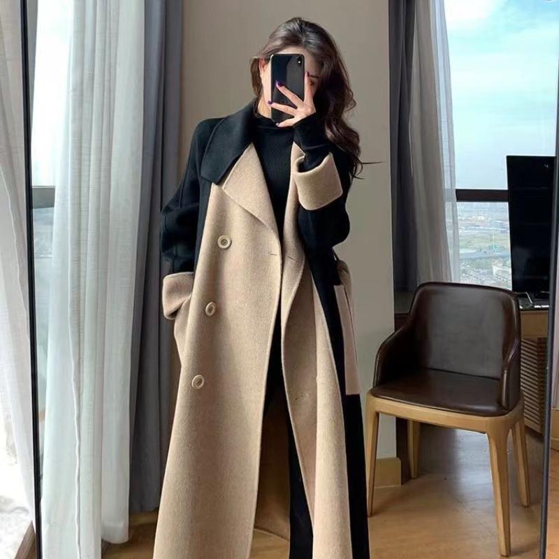 Весеннее пальто 2024, двубортное женское пальто одинакового размера средней длины с двусторонним отложным воротником и теплыми карманами