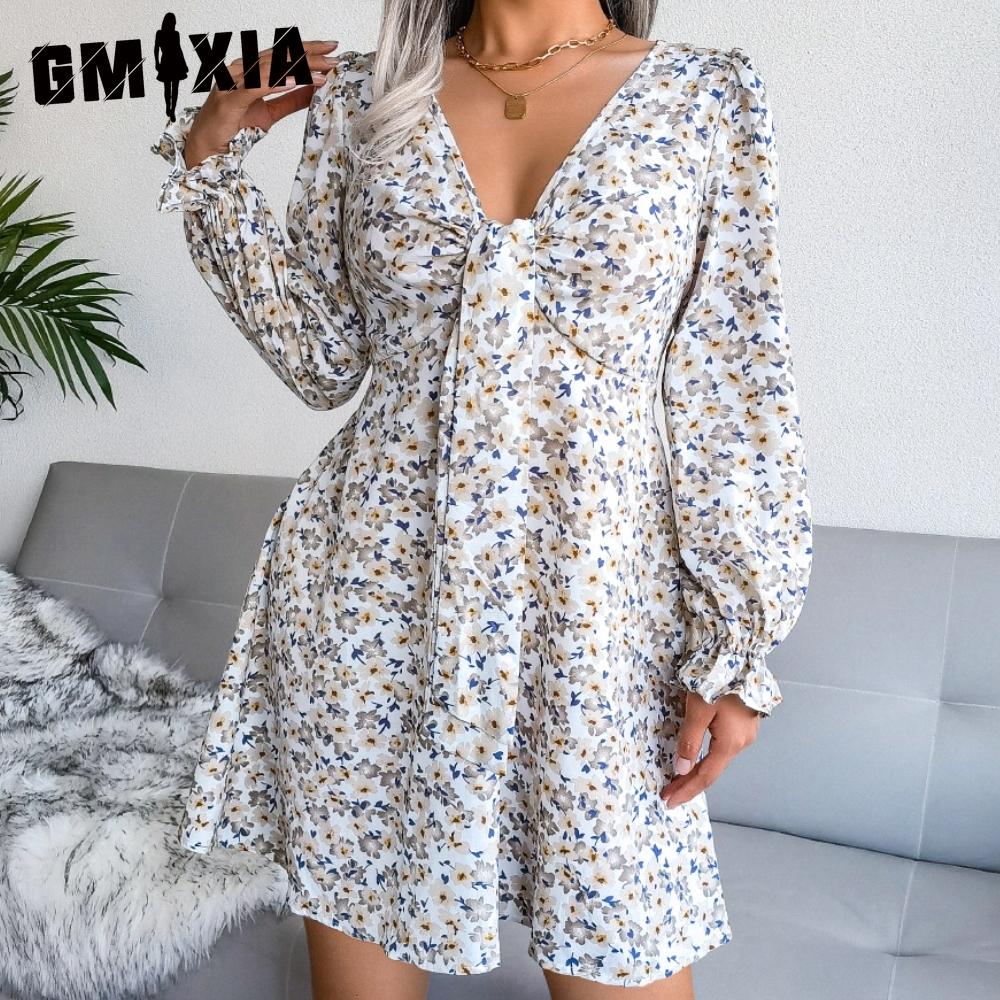 GMXIA Весенне-летнее повседневное шифоновое платье с бантом и цветочным принтом для женщин