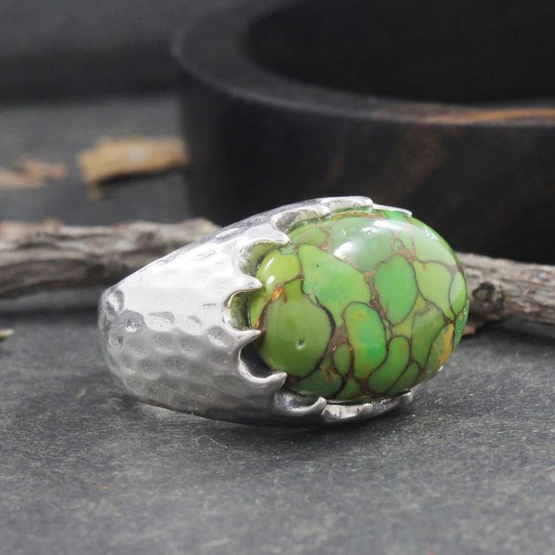 МАТЕРИАЛ - Серебро 925 пробы | Драгоценный камень — зеленая медь, бирюза. Создана в лаборатории ФОРМА ДРАГОЦЕННОГО КАМНЯ — овальный размер камня — примерно 12x16 мм | ВЕС КОЛЬЦА - 5-8 грамм | ЦВЕТ ДРАГОЦЕННОГО КАМНЯ- Зеленый