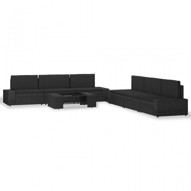 Este juego de muebles de ratán sintético es una combinación perfecta de estilo y funcionalidad. Con esto en el jardín, puedes pasar el rato relajándote y descansando con tu familia y amigos. Gracias al ratán PE resistente a la intemperie, el asiento es fácil de limpiar, resistente y adecuado para usar a diario. El sofá posee una robusta estructura de acero con recubrimiento en polvo, por lo que es muy duradero. Los cojines de respaldo y de asiento extraíbles están bien acolchados para ofrecer gran comodidad al sentarte. La mesa de centro, con un diseño sobrio, puede sostener tus libros, revistas y café para pasar un rato tranquilo y relajante. Además, con un notable diseño modular, todas las piezas pueden colocarse y personalizarse como quieras. Este juego de asientos sin duda será el centro de atención de tu jardín o patio. Nota: Recomendamos cubrir el conjunto en caso de lluvia, nieve y heladas. Color: NegroMaterial: Ratán PE, tela (100% poliéster), acero con recubrimiento en polvo, vidrio templadoSofá central:Dimensiones: 58,5 x 65,5 x 52 cm (ancho x profundo x alto)Anchura del asiento: 58,5 cmProfundidad del asiento: 60,5 cmAltura de asiento: 26 cmDimensiones del cojín de respaldo: 58,5 x 30 x 8 cm (largo x ancho x grueso)Dimensiones del cojín del asiento: 58,5 x 60 x 8 cm (largo x ancho x grosor)Sofá de esquina:Dimensiones: 78,5 x 65,5 x 52 cm (ancho x profundo x alto)Anchura del asiento: 58,5 cmProfundidad del asiento: 60,5 cmAltura de asiento: 26 cmAncho del reposabrazos: 20 cmAltura del reposabrazos: 33 cmDimensiones del cojín de respaldo: 58,5 x 30 x 8 cm (largo x ancho x grueso)Dimensiones del cojín del asiento: 58,5 x 60,5 x 8 cm (largo x ancho x grosor)Mesa de centro:Dimensiones: 90 x 50 x 26 cm (largo x ancho x alto)Grosor del vidrio: 5 mmRequiere montaje: SíLa entrega incluye::1 x Mesa de centro2 x Sofás centrales2 x Sofás esquineros con reposabrazos izquierdo2 x Sofás esquineros con reposabrazos derecho6 x Cojines de respaldo6 x Cojines de asiento Reclamaciones solo seran atendidas hasta 5 dias despues de recibido su pedido