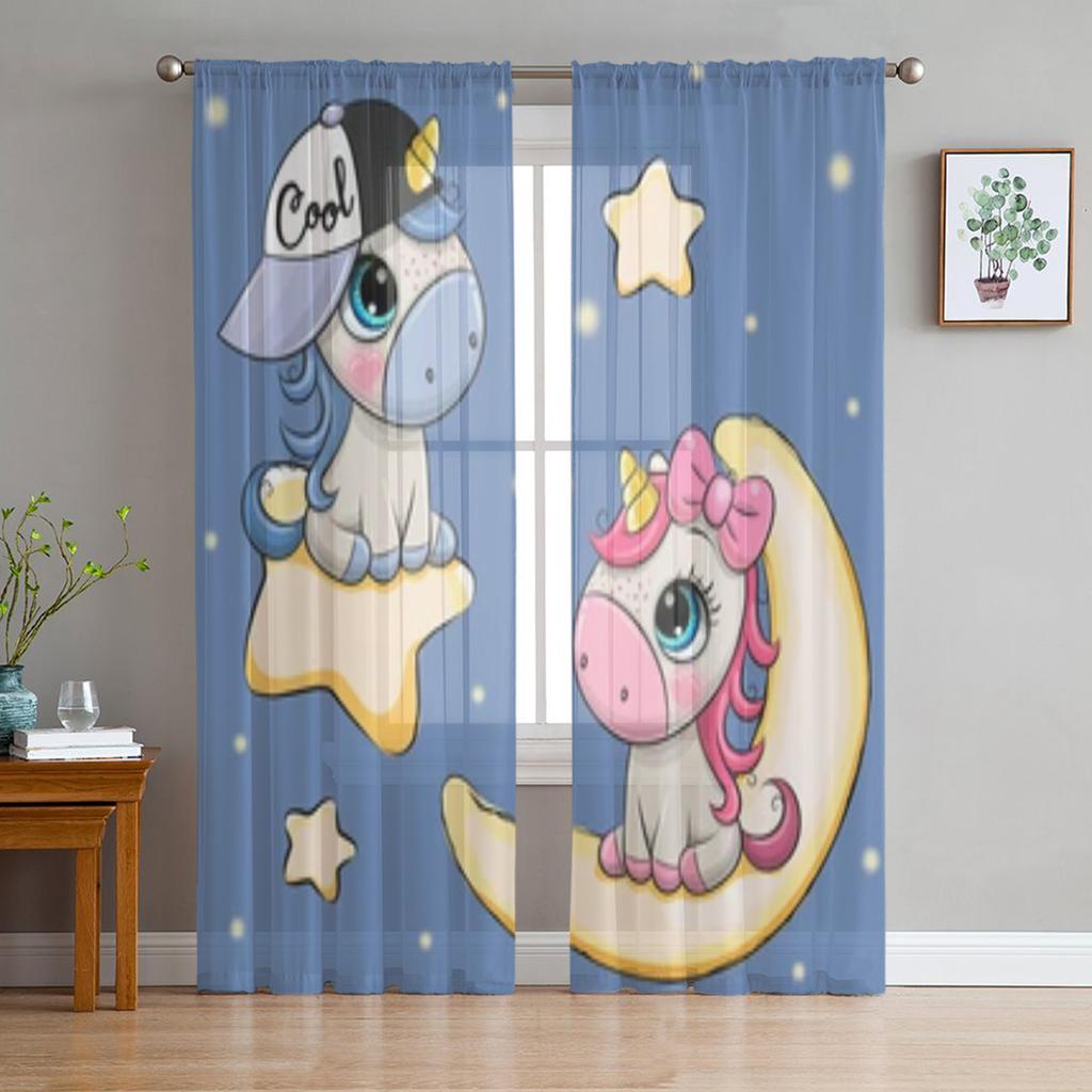 Милые единороги на луне, прозрачные оконные шторы для гостиной, спальни, современная вуаль, тюлевые шторы, тканевые шторы для кухни