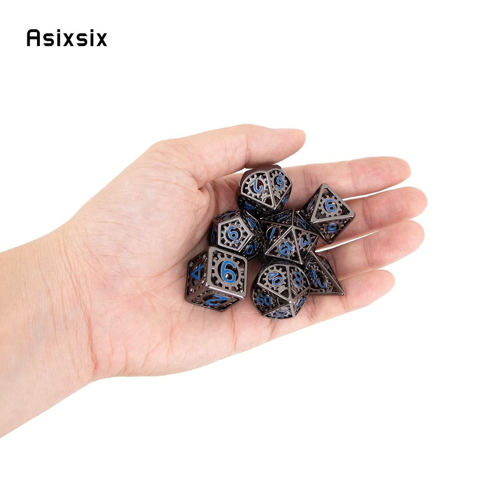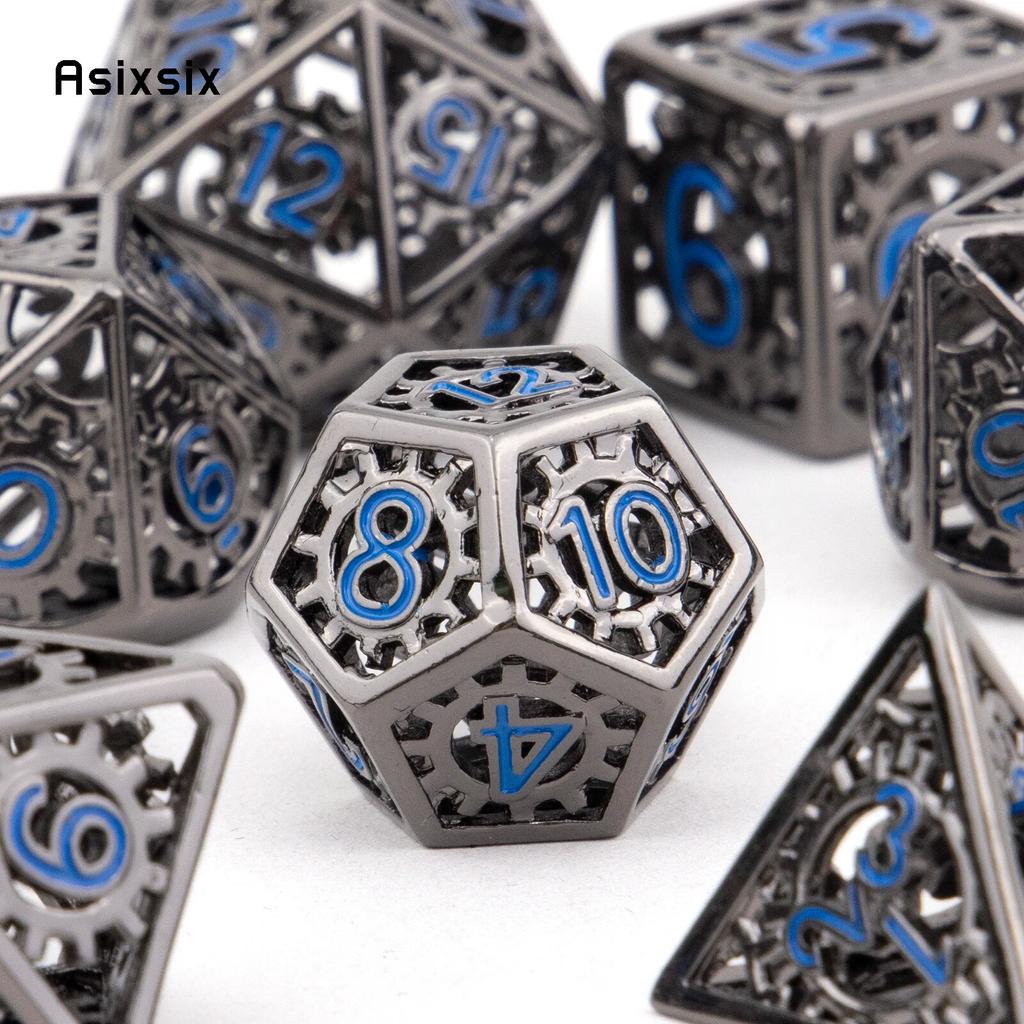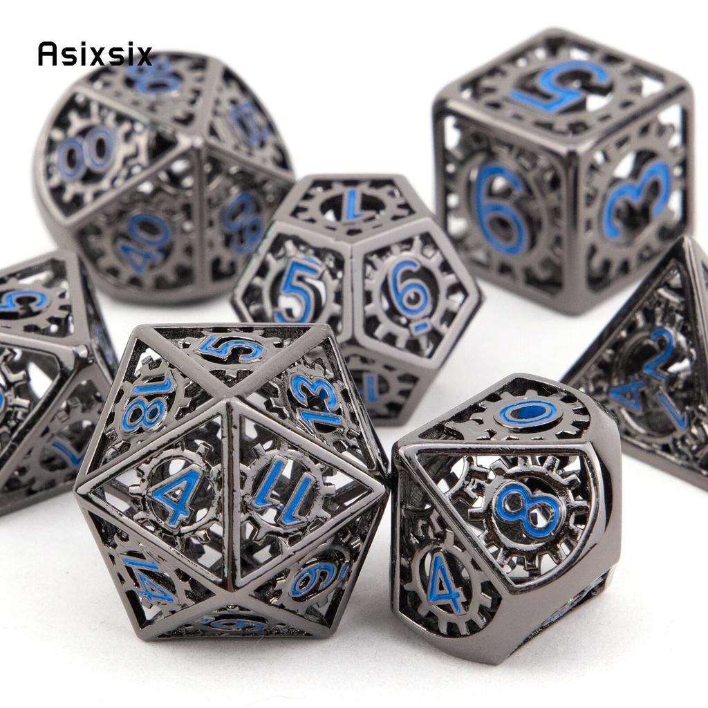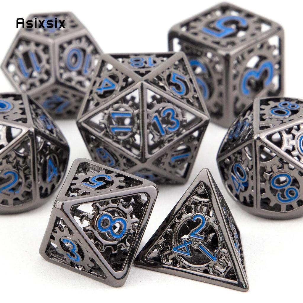 7 шт., черные, синие зубчатые колеса, металлические кубики, набор полых металлических многогранных кубиков, подходит для ролевой игры, настольной игры, карточной игры