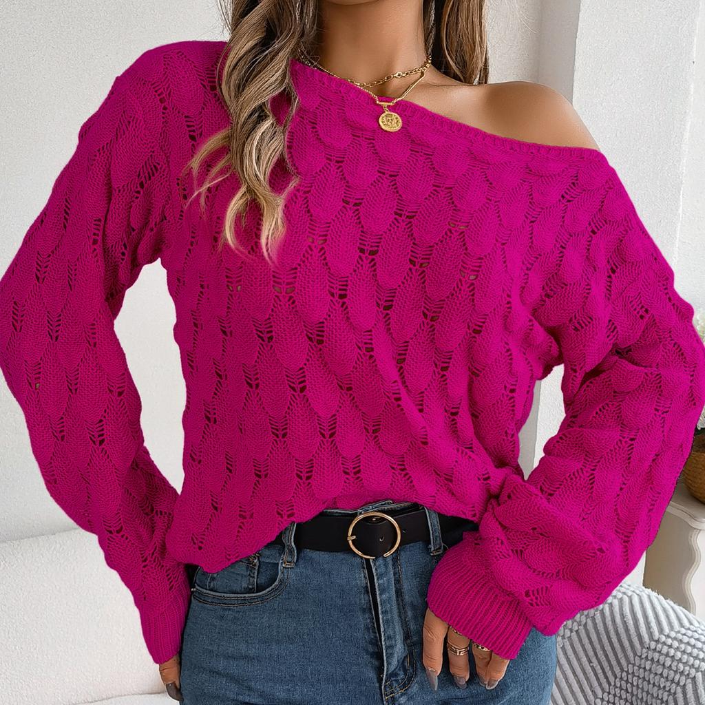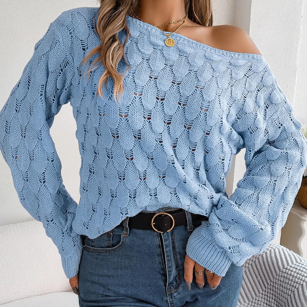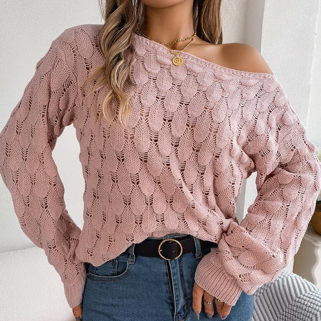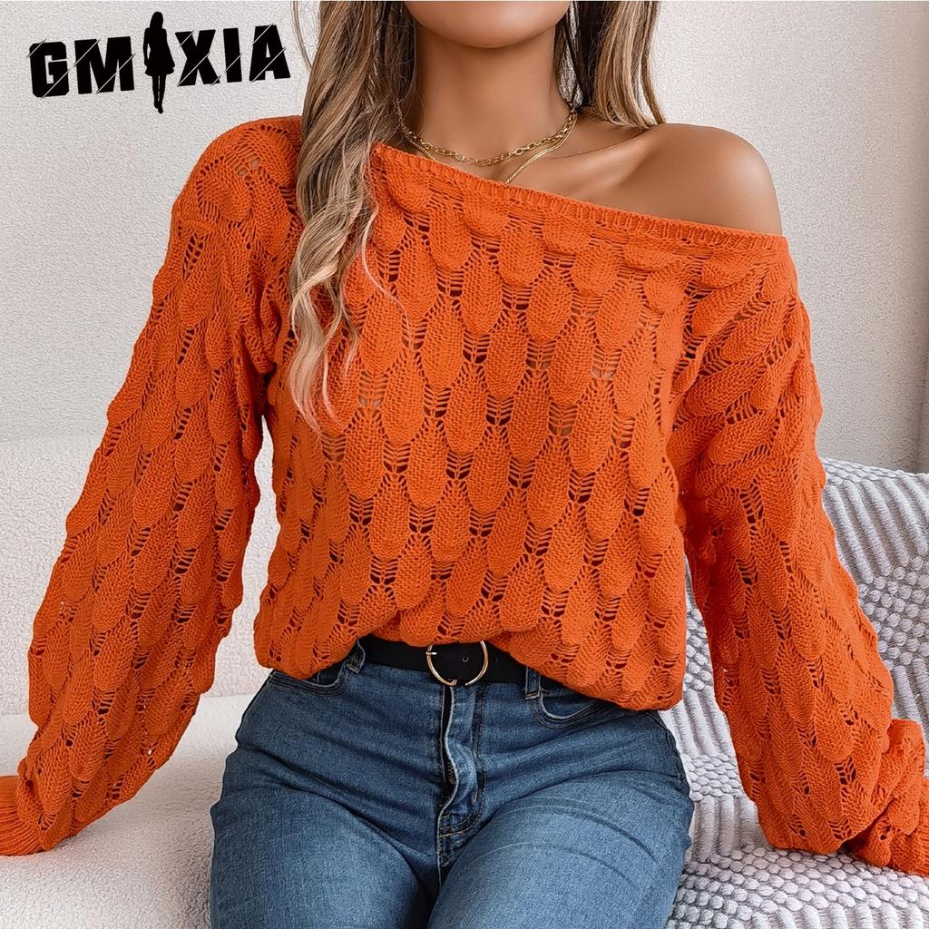 GMXIA Женская мода, повседневный осенне-зимний свободный однотонный свитер с длинными рукавами и вырезами, однотонный свитер с рукавами-фонариками и открытыми плечами