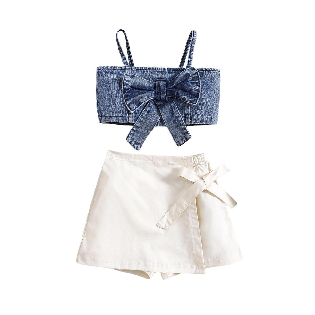 Детский летний комплект из двух предметов для девочек, 1 год, 2 года, 3 года, 4 года, 5 лет, 6 лет, однотонный джинсовый топ без рукавов с бантом и эластичная повседневная юбка, шорты, комплект