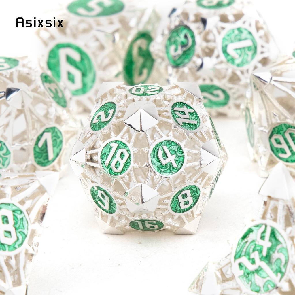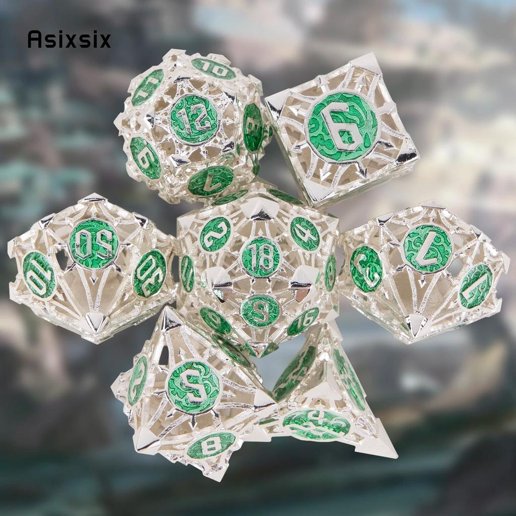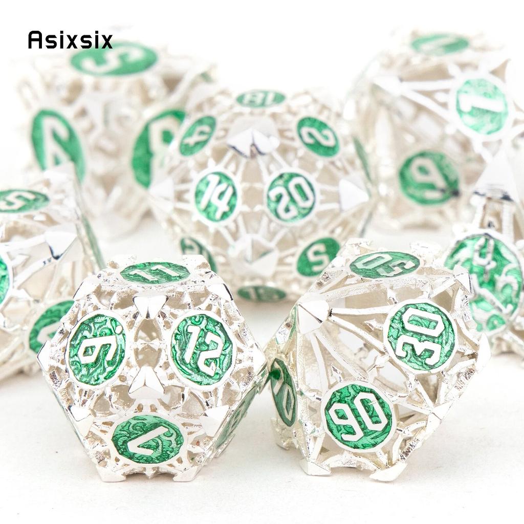 7 шт. серебристо-зеленые металлические кубики, набор полых металлических многогранных кубиков, подходящий для ролевой ролевой игры, настольной игры, карточной игры