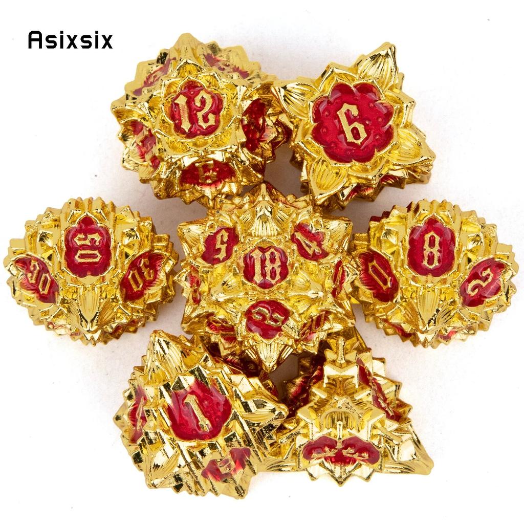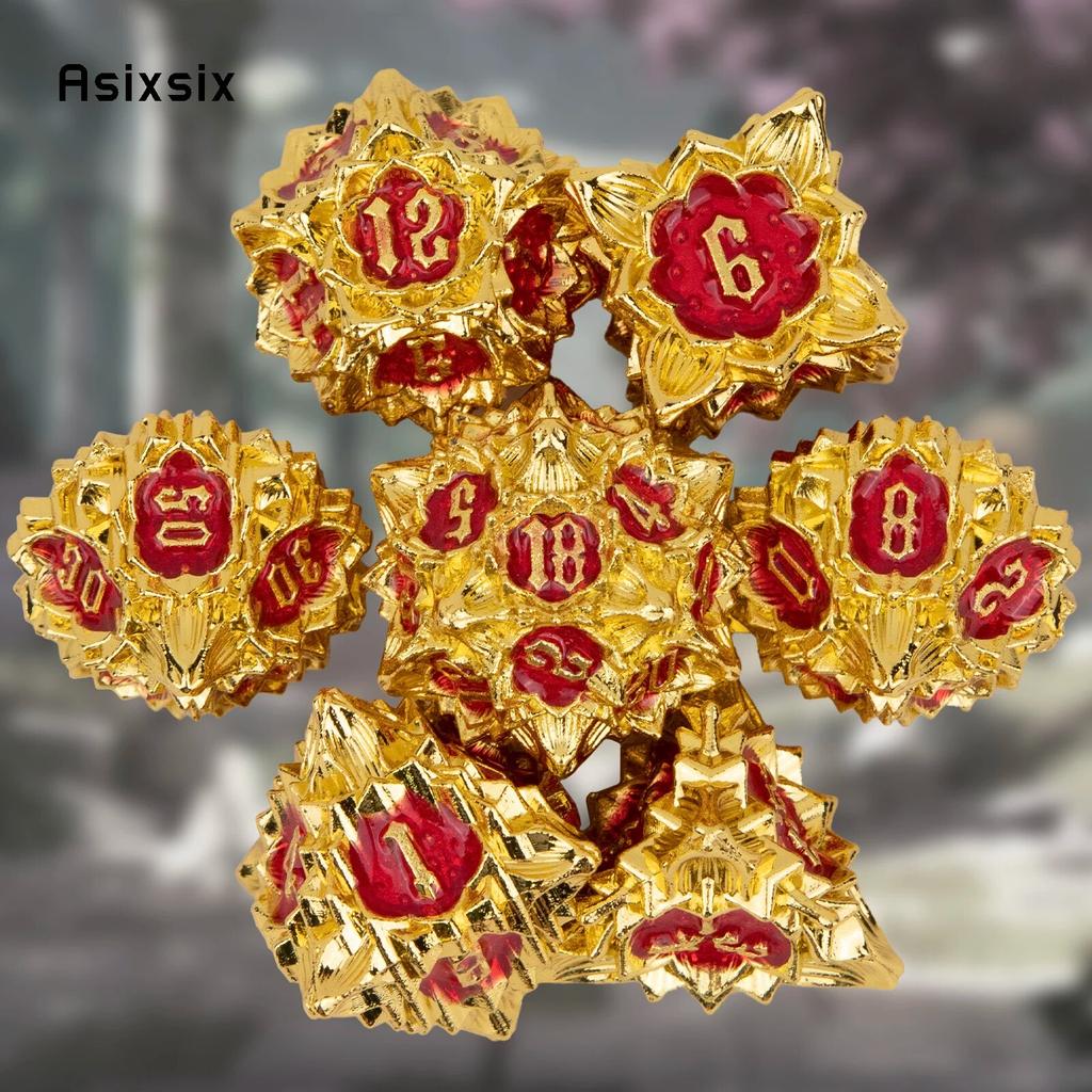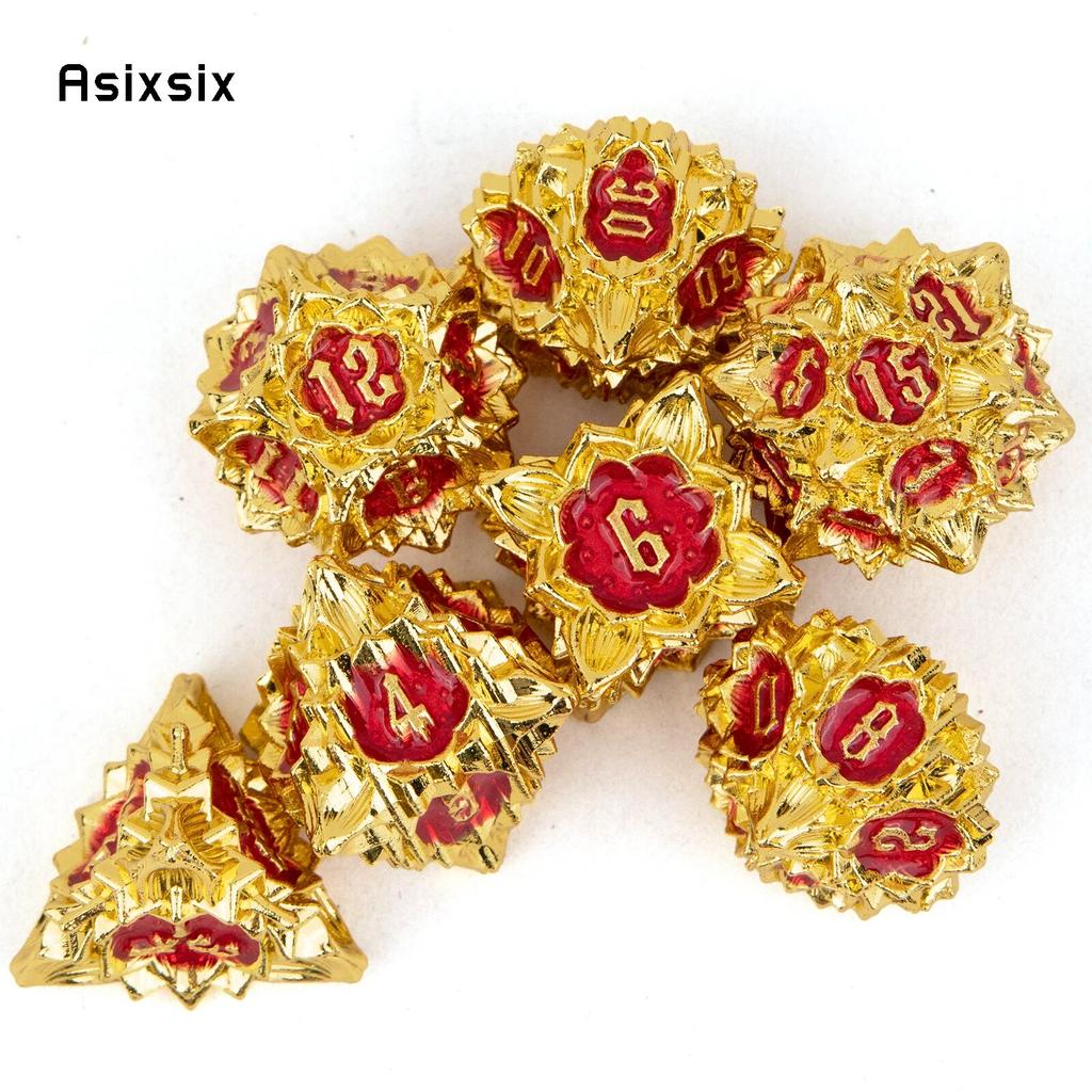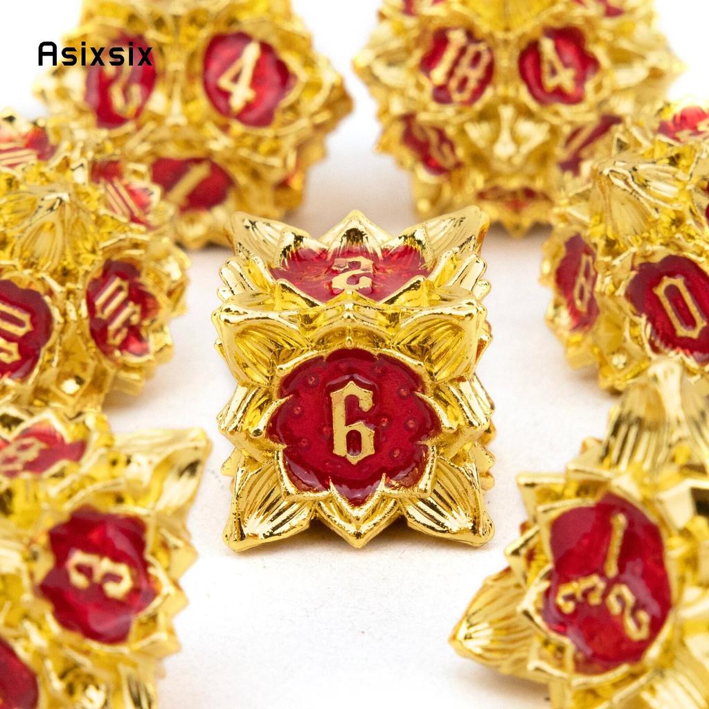 7 шт. золотисто-красный цветок лотоса, металлические кубики, набор твердых металлических многогранных кубиков, подходящий для ролевой игры, настольной игры, карточной игры