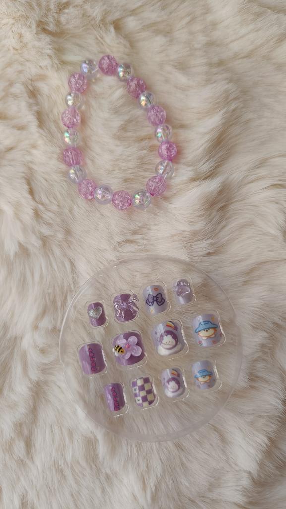 Детские накладные ногти) На них уже есть специальный клей, снимать легко со своих ногтей) В комплекте идёт браслет, в цвет ногтей. У продавца можно выбрать другие цвета (мых взяли фиолетовый) В принципе симпатичные)) особенно те ноготочки, которые со стразиками с лапкой, бантиком) оч мило смотрится) ✈️ доставка до Амурской области, г. Благовещенск менее месяца)
