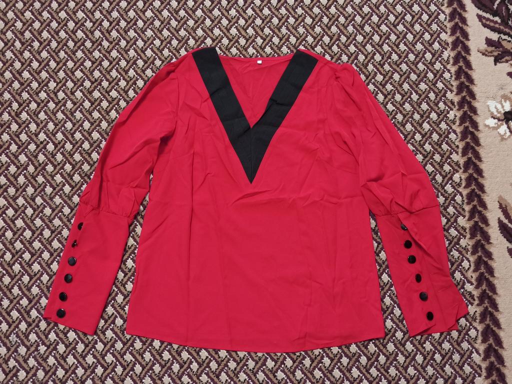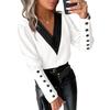 V-образный вырез и дизайн контрастных цветов, а также украшение пуговицами и длинные рукава добавят элегантности вашему образу..