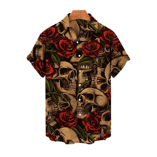 Однобортная мужская рубашка с отворотом и коротким рукавом, летняя гавайская рубашка с цветочным принтом и черепом, пляжная одежда