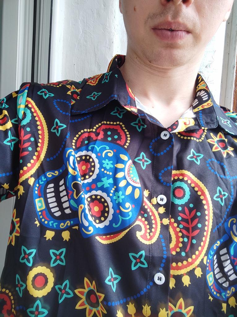 Как на картинке, размер идеально подошел. Спасибо большое. На ощупь приятная рубашечка. Пойду в мексиканский ресторан обязательно в ней