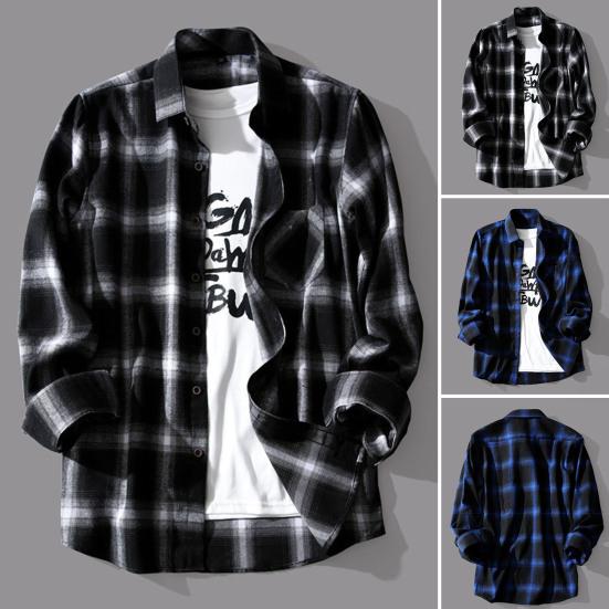 Мужская весенняя рубашка с клетчатым принтом и длинными рукавами контрастных цветов, отложной воротник с лацканами, теплое однобортное осеннее пальто на пуговицах подходящего цвета