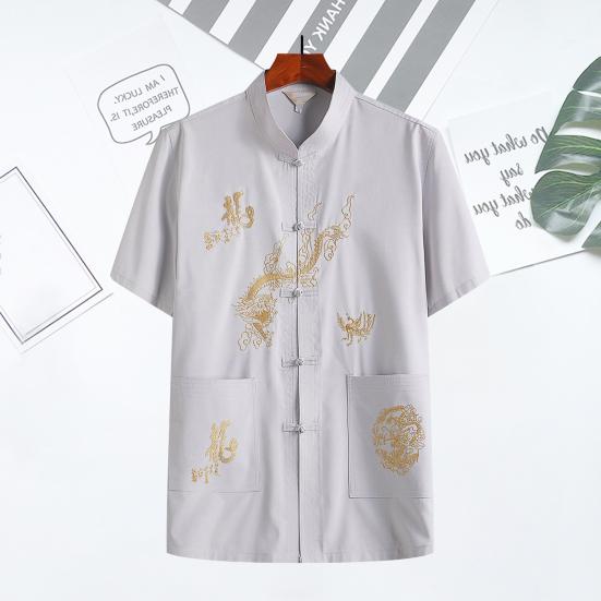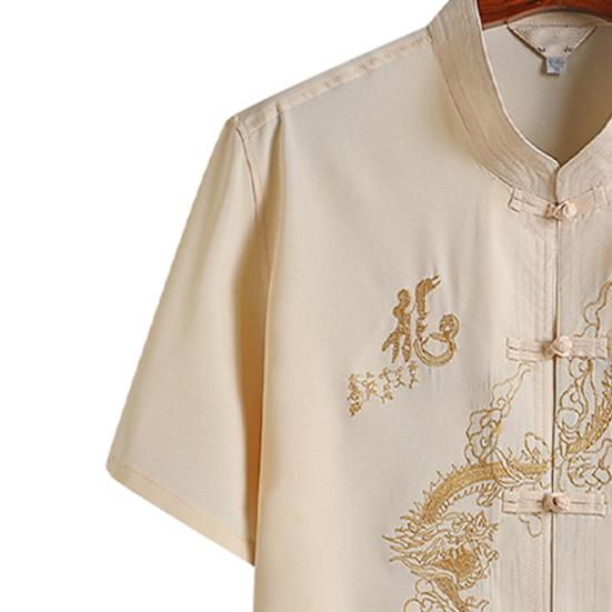 Тан Костюм Топ Вышивка Дракон Сплошной Цвет Стенд Воротник С Коротким Рукавом Новогодняя Одежда Супер Мягкая Китайская Кунг-Фу Вин Чун Рубашка Одежды Мужская Одежда