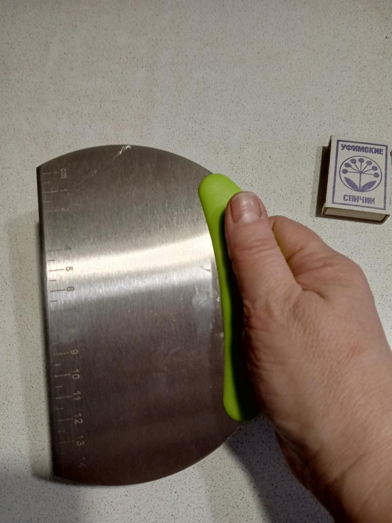 Ручка удобная. Скребок в меру тяжёлый. Тесто с него действительно легко чистится. С каждой стороны есть разметка. Очень рекомендую.