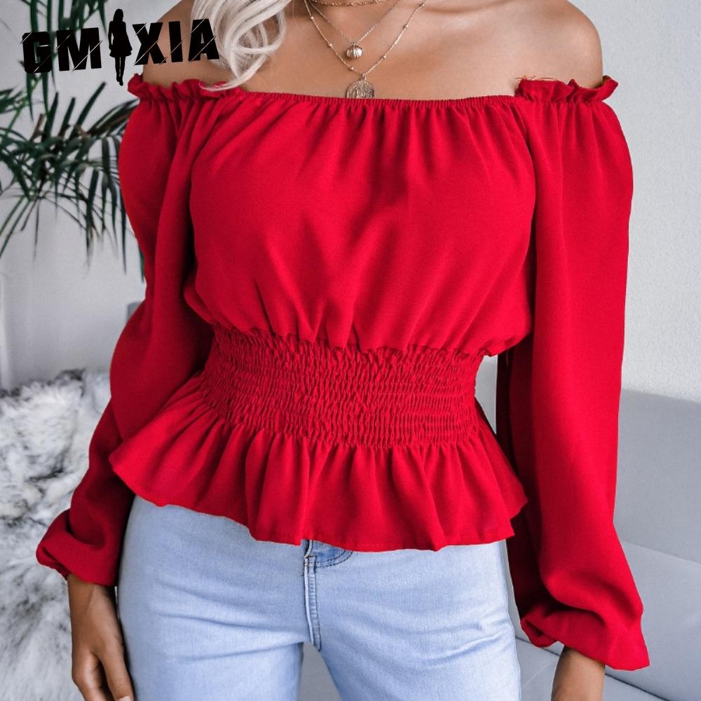 GMXIA Женские модные повседневные летние однотонные узкие блузки с длинными рукавами и сексуальным вырезом, подол с открытыми плечами, шифоновые топы с рюшами — купить товар онлайн с бесплатной доставкой по всему миру!