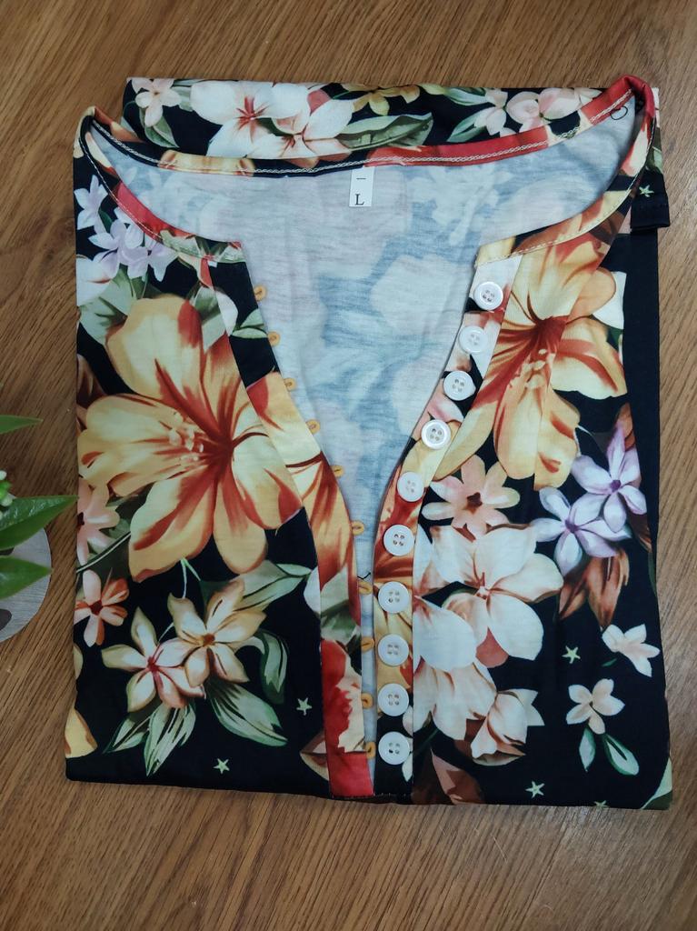Блуза GMXIA Блуза с изящным цветочным узором и V-образным вырезом, который можно регулировать по своему усмотрению с помощью пуговиц, пришлась мне по душе. На мне размер L, сидит идеально. Мои параметры: - Рост: 161 см - Обхват груди: 93 см - Обхват талии: 86 см - Обхват бедер: 100 см Замеры блузки в размере L: Ширина: 52 см (на обхват груди 104 см) Длина от горловины до низа:67 см Длина рукава: 45 см Изготовлена блузка из приятной ткани с содержанием полиэстера 65% и хлопка 35%. Продукт соответствует изображению продавца: ровные строчки, отсутствие выступающих ниток. Размерная сетка точно соответствует заявленным параметрам. В целом, весь товар вызвал положительные эмоции, и я рекомендую его к приобретению. Пожелания всем удачных покупок и приятных эмоций! 🤗