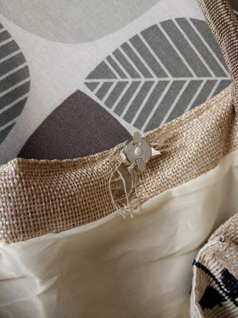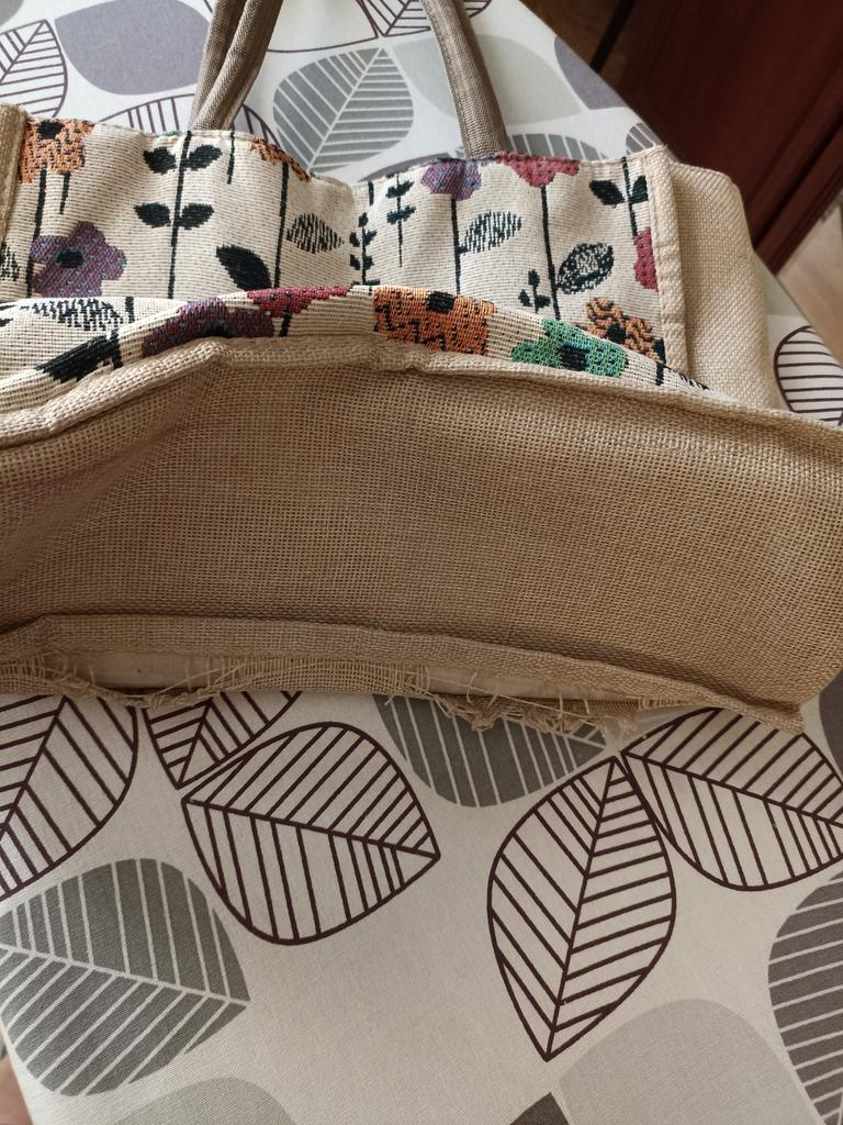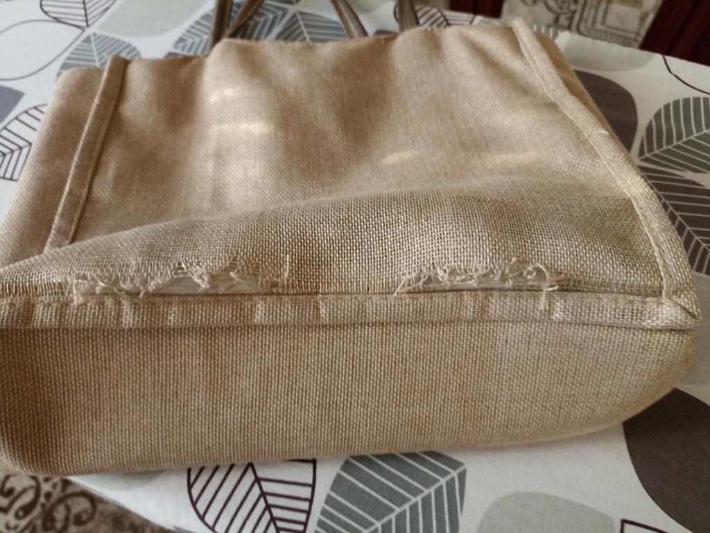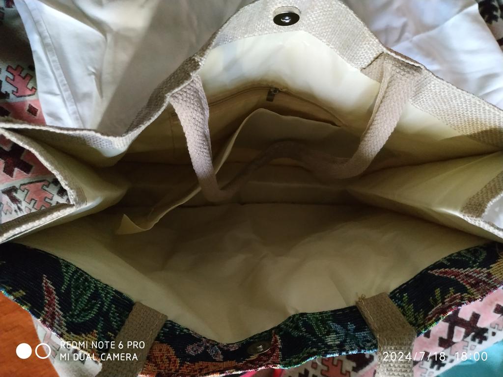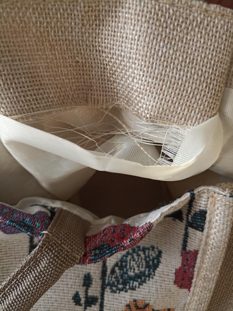 Купила вот эту сумку, теперь голову ломаю куда еë приспособить. Для магазина мала, да и город с ней не пойдëшь, страшненькая, закрывается на одну кнопку. А в сумку дамскую еë не положить, объёмная. Внутри сумки брошена картонка, типа дно. Но эта картонка меньше дна самой сумки сантиметров на 15. Для пляжа эта сумка тоже мала. Ручки пришиты совершенно другого цвета. По лицевой стороне я стригла всюду торчащие нитки.