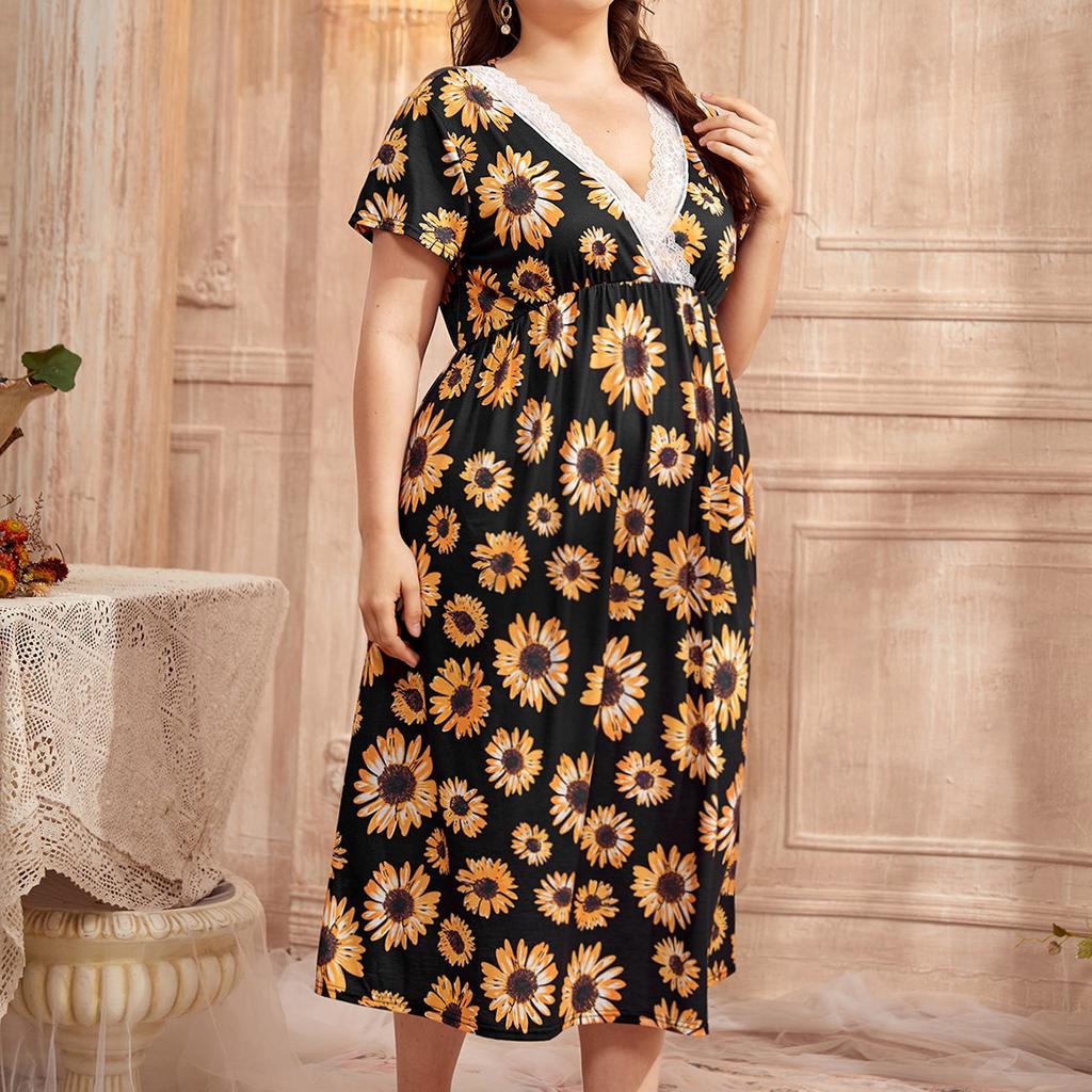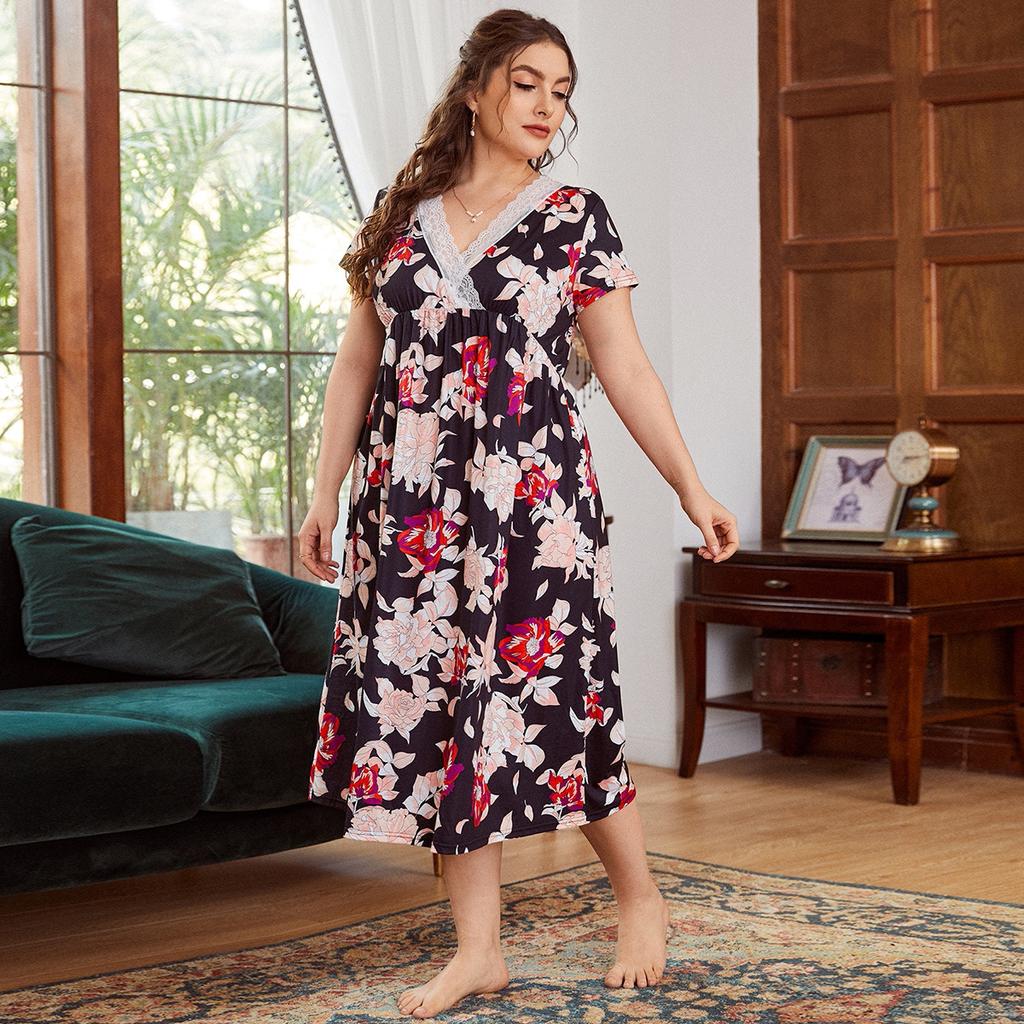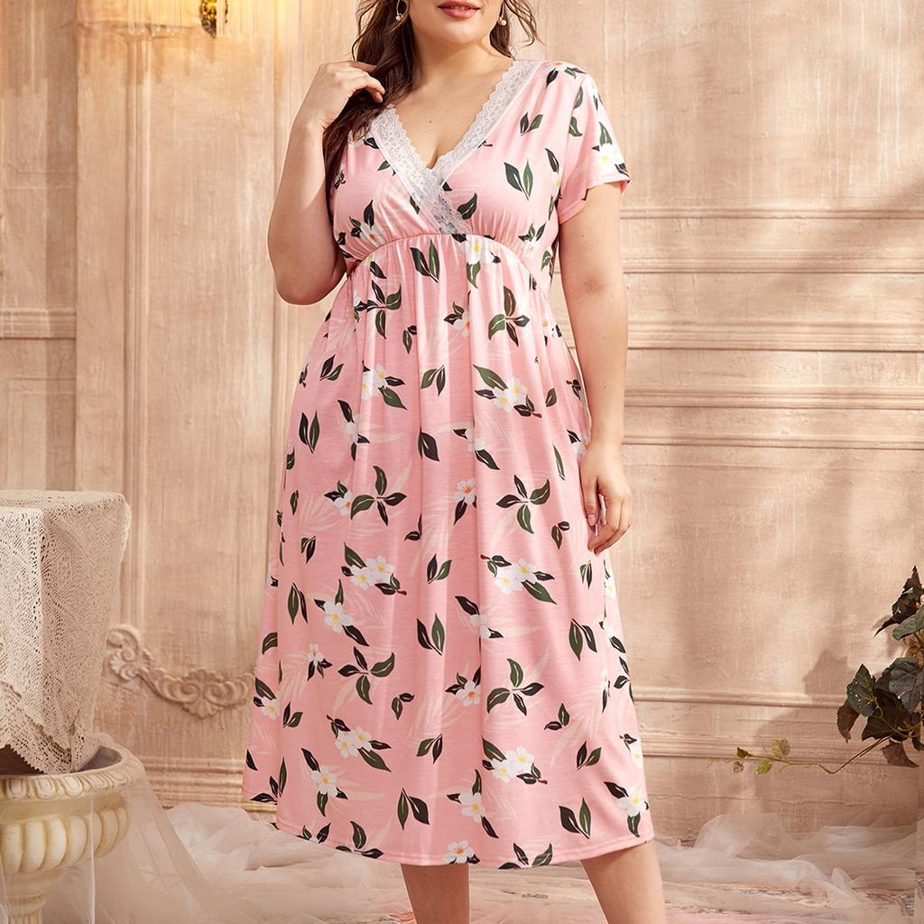 Весенне-летняя ночная рубашка большого размера, женская домашняя одежда, пижамы, кружевные ночные рубашки с v-образным вырезом и принтом, короткие рукава