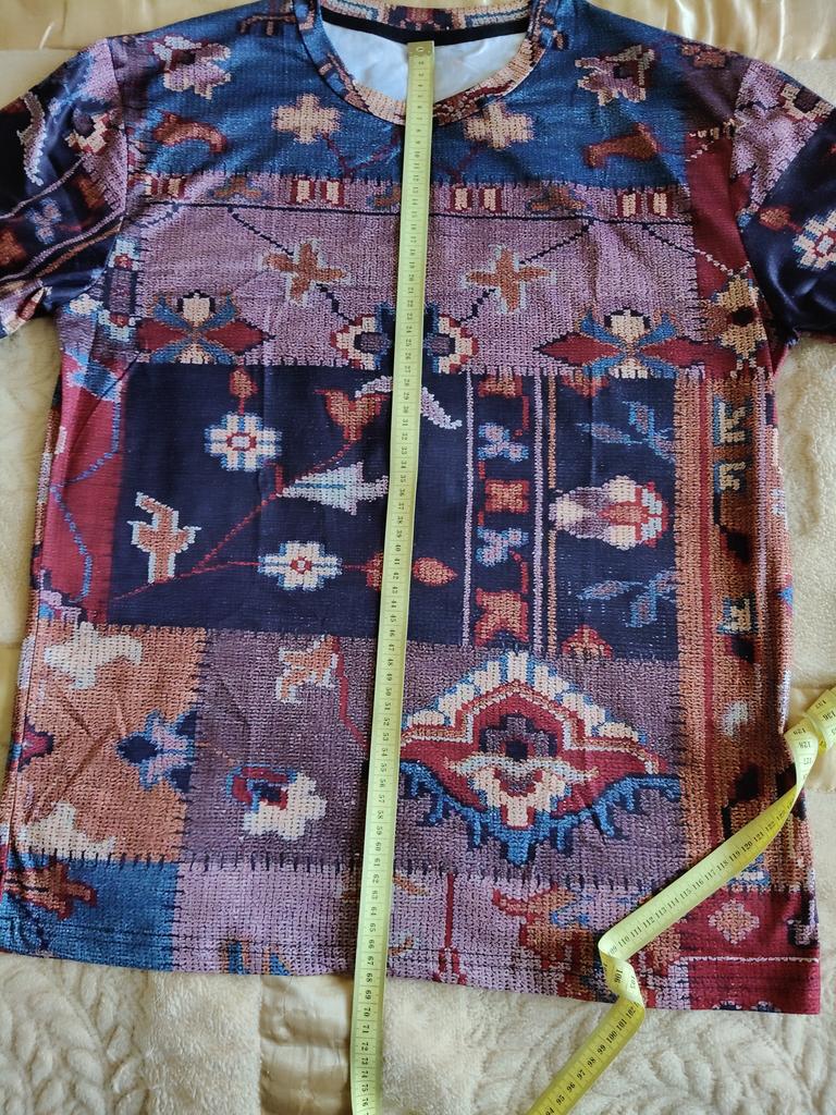 Оценить невозможно. Пришла футболка совсем не того фасона. На фото другая модель, на модели от талии присутствуют защипы-складки, что дает к низу расширение, рукав начинается от плеча, по боковым сторонам низ закруглен. Фактически футболка пришла со спущенными рукавами по плечам, от проймы до низа сшита по прямой и естественно уже не смотрится как на фото, жаль.