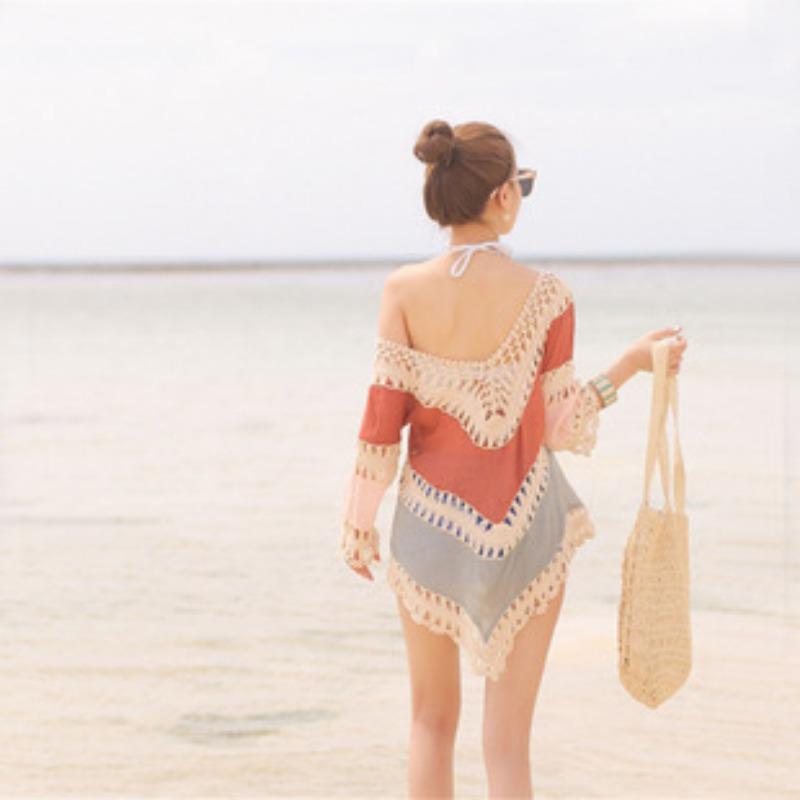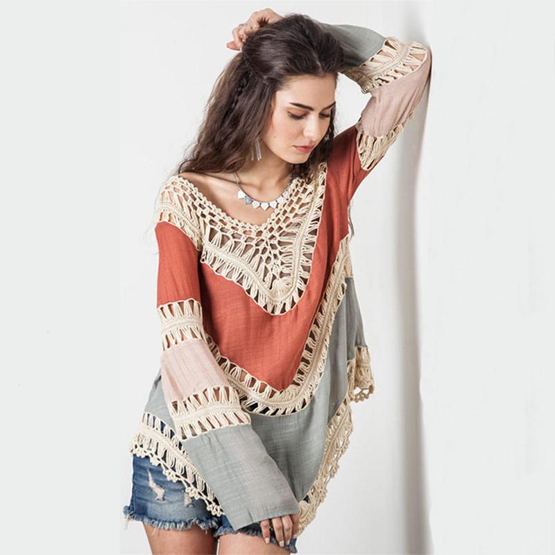 Женская блузка, богемное свободное пляжное накидка, вязаный свитер с длинными рукавами и цветочным принтом, солнцезащитный крем