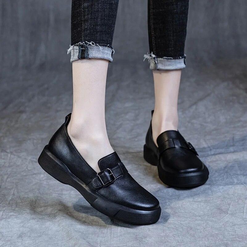 Женские туфли на плоской подошве, британский стиль, весенне-осенние лоферы с круглым носком и неглубоким слипером, женские туфли из воловьей кожи большого размера