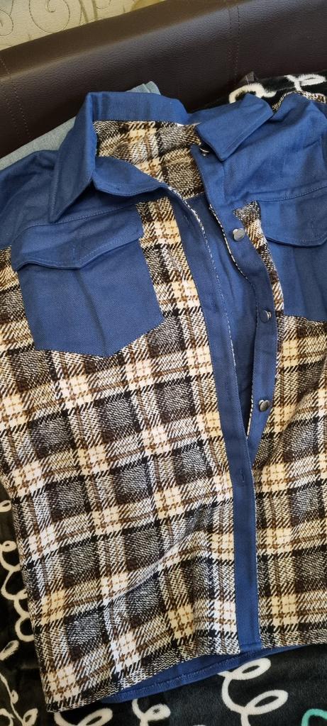 Джинсовой ткани ,как заявлено, нет. Просто плотная голубая ткань. Клетчатая ткань не черно- белая, а коричневая. Сшито неаккуратно, везде торчат нитки, клапаны карманов пришиты на разном уровне, до карманов не дотягиваются. Сплошное разочарование.