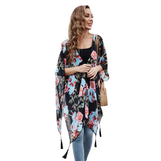 Летний пляжный халат с цветочным принтом Быстросохнущий декор с кисточками Солнцезащитный крем Свободный пончо Купальник Открытая пляжная одежда Кардиган Нерегулярный отдых