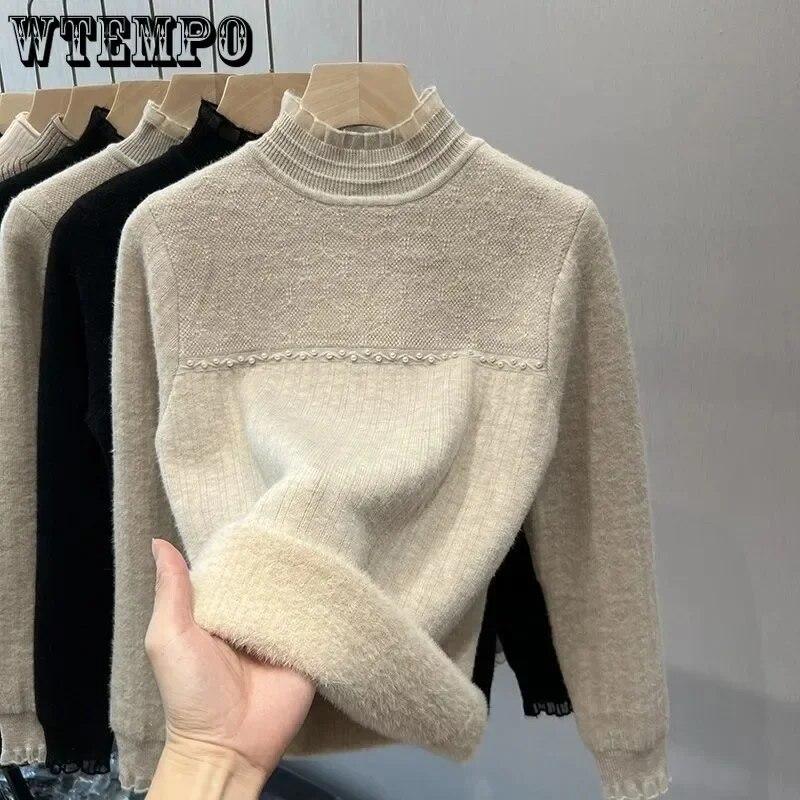 Кружевной трикотаж, теплый интегрированный плюшевый женский свитер, тонкий утепленный пуловер с полувысоким воротом, жемчужный джемпер, осень-зима