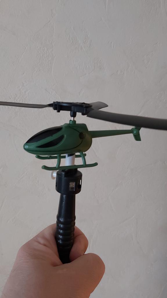 Дешевенький вертолётик. Собирается легко. И даже чуть-чуть летает, не особо высоко. Пусковой механизм хлипковат, но чего вы хотите за такую денежку. На неделю поиграться хватит.