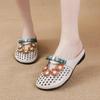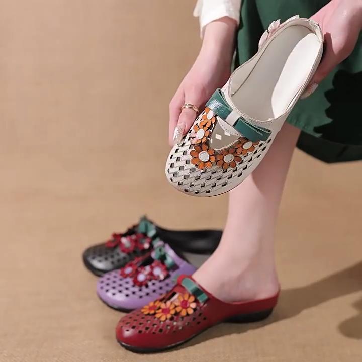 Johnature Тапочки из натуральной кожи с цветочным узором в этническом стиле. Женская обувь на низком каблуке. Полые наружные шлепанцы.