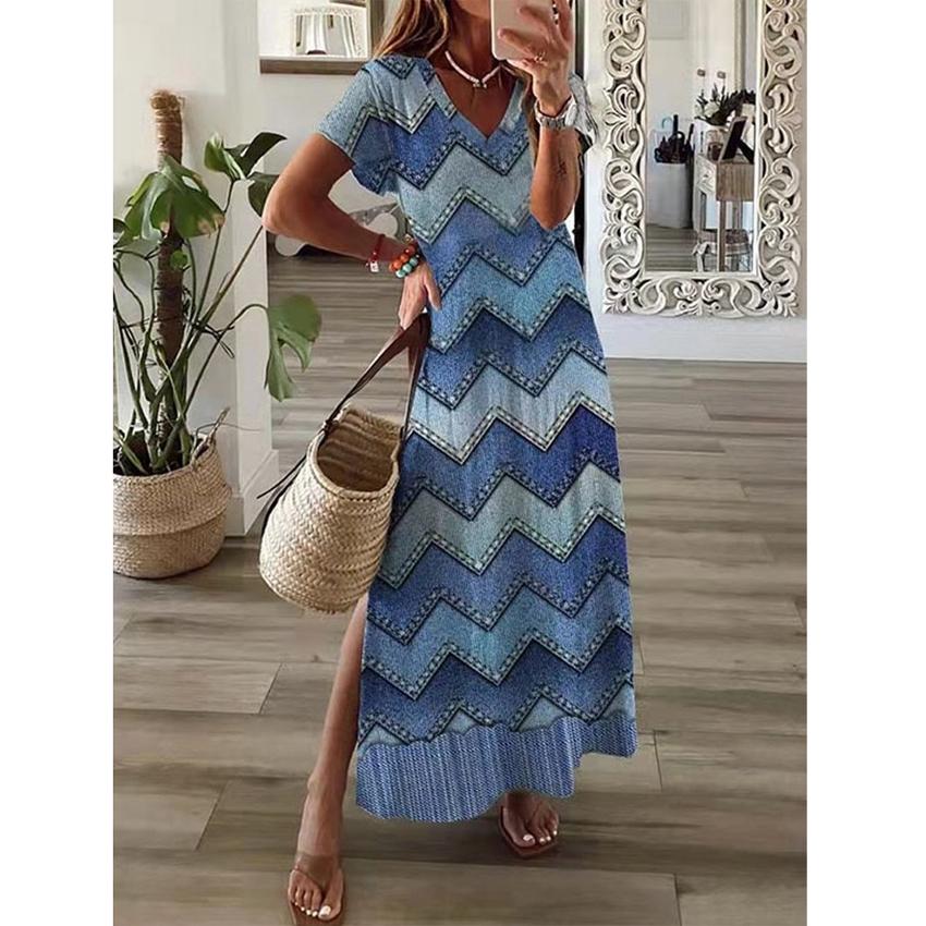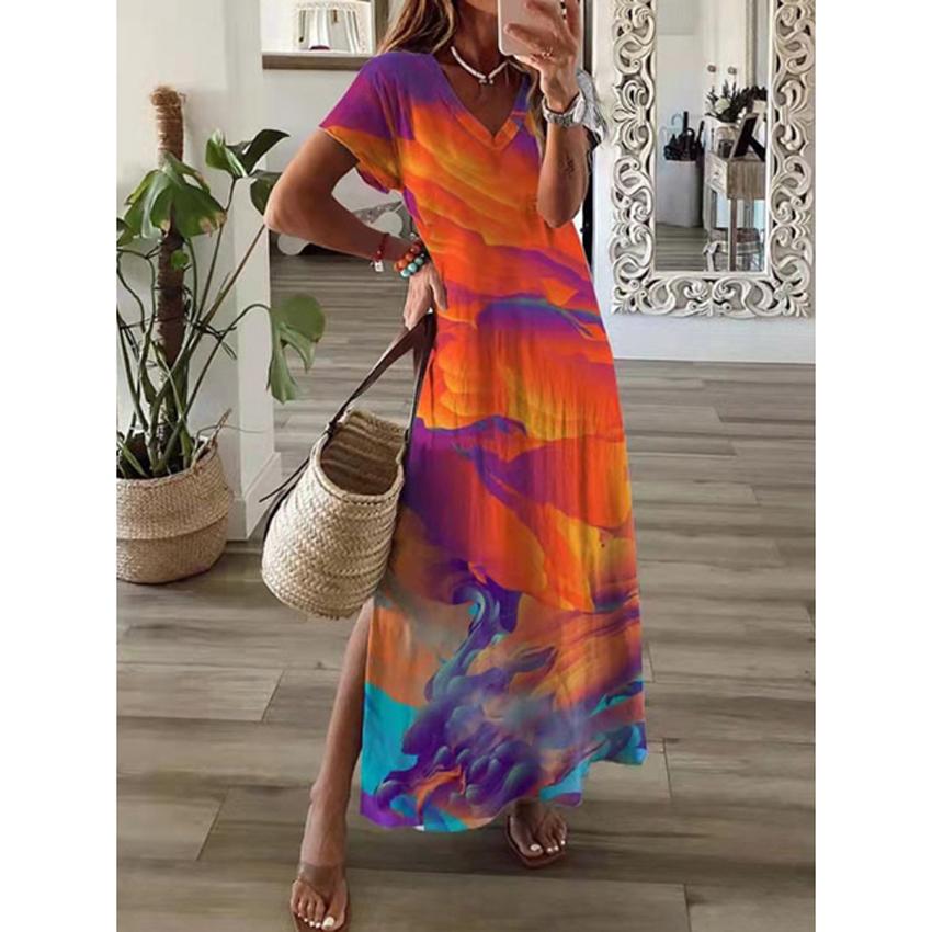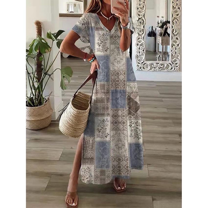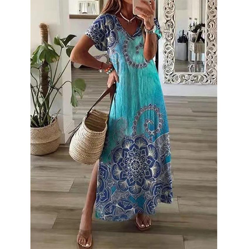 Модное свободное пляжное платье с v-образным вырезом и разрезом, женское длинное платье с ретро-принтом, летнее элегантное платье макси с короткими рукавами