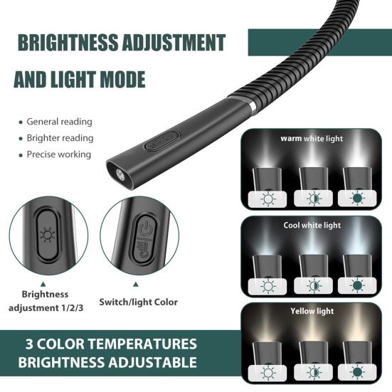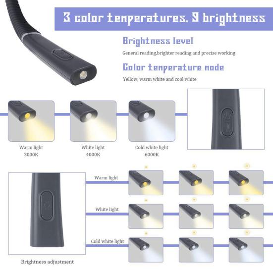 Фонарь для шеи изготовлен из приятного для кожи материала и имеет регулируемый кронштейн, обеспечивающий комфорт и гибкость.. Благодаря 3 режимам цветовой температуры и 3 уровням яркости этот светильник снижает утомляемость глаз и предлагает лучшие варианты освещения для чтения и работы.