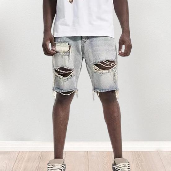 Мужские летние потертые джинсовые шорты на пуговицах на молнии с несколькими карманами Короткие джинсы прямого кроя с рваными отверстиями длиной до колена потертые джинсовые шорты