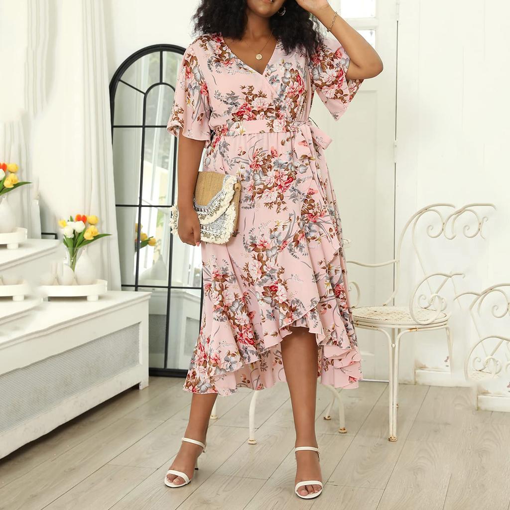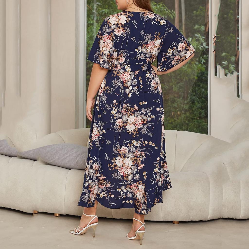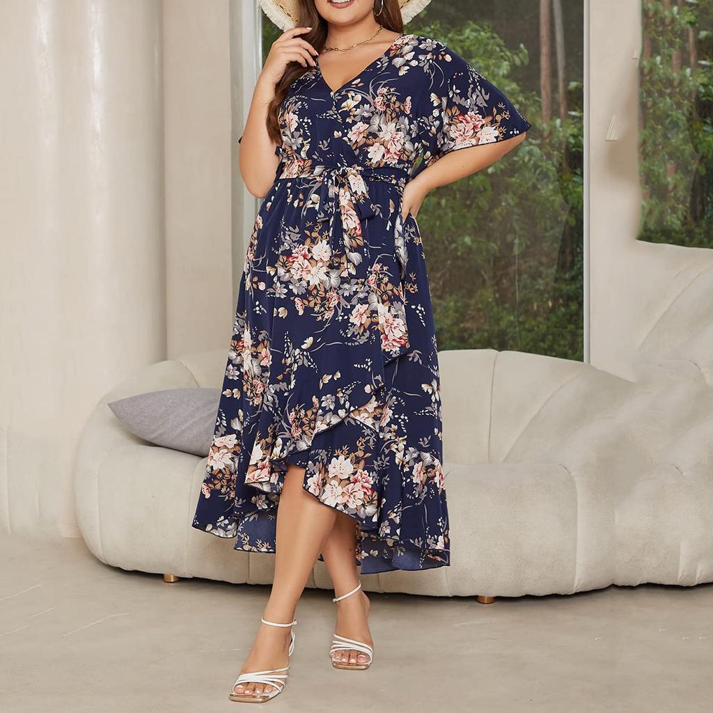 Летнее женское платье размера плюс с v-образным вырезом и короткими рукавами, свободные платья с высокой талией и нерегулярным подолом, рыбий хвост