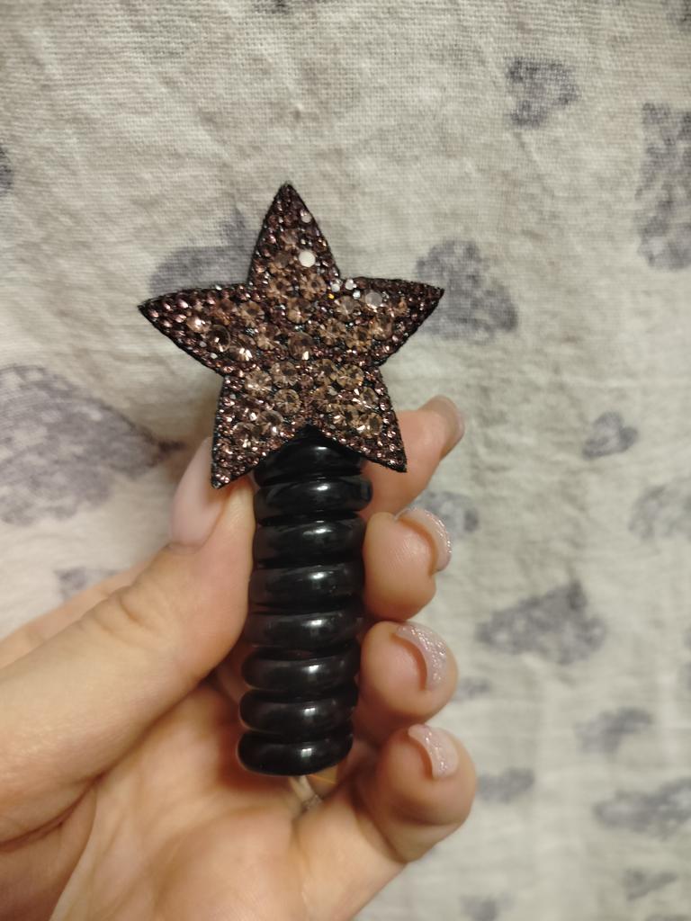 Красивая пружинка. Стразы блестят. Запаха нет. На толщину полного хвоста не хватает ширины пружинки. По длине не сильно растягивается, поэтому хвост прибран не весь. Зажим держится на резинке хорошо. Звёздочка очень быстро отвалилась