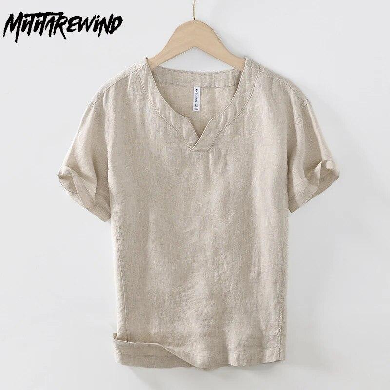 Летние футболки из 100% натурального льна, мужские футболки в китайском стиле, ретро-одежда, сплошной цвет, воротник-стойка, v-образный вырез, топы с короткими рукавами и футболки, повседневная дышащая футболка