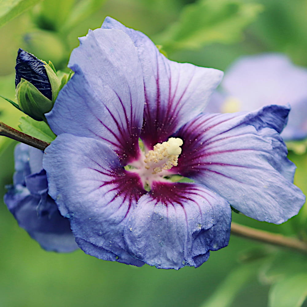 Листопадный кустарник с яркими голубыми цветками.. Многолетнее растение, сбрасывающее зимой листья.. Цветки крупные, эффектные, с чашечками, напоминающими цветки мальвы интересного голубого цвета.