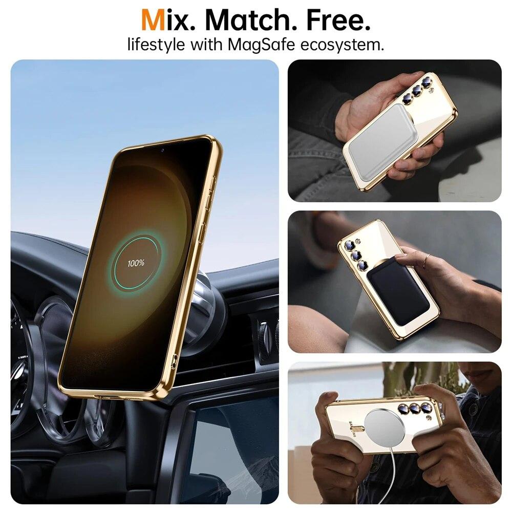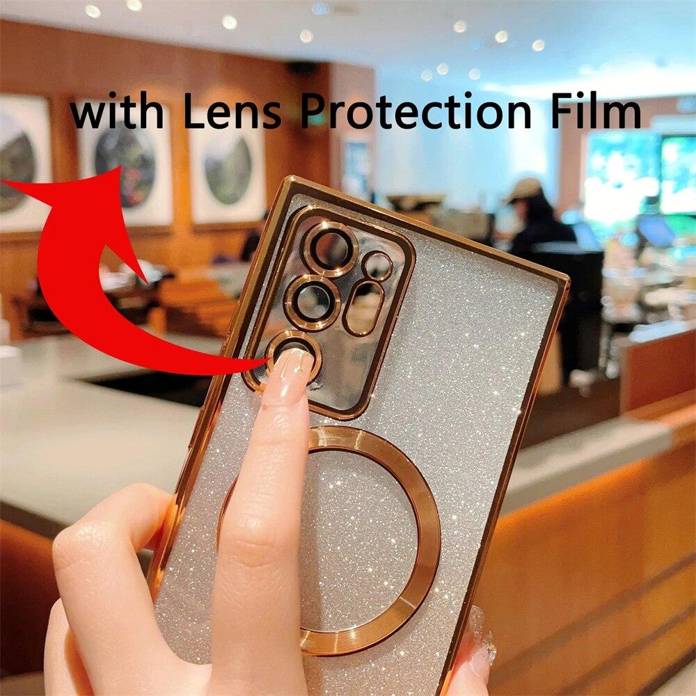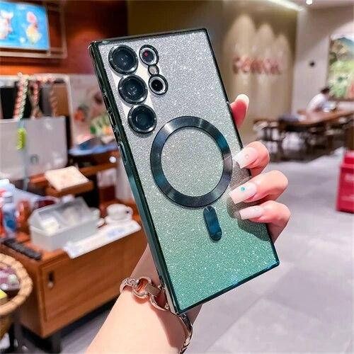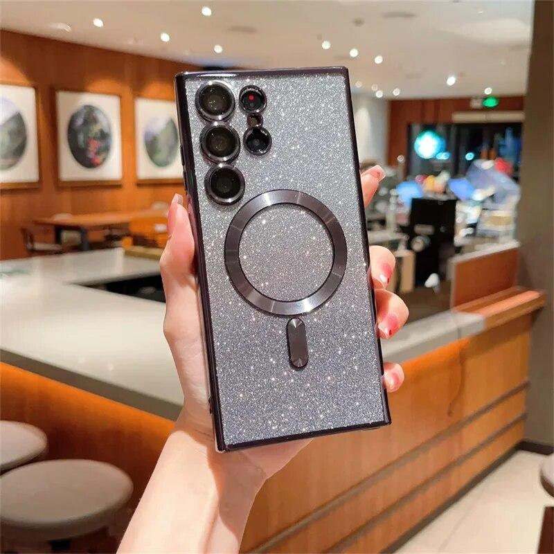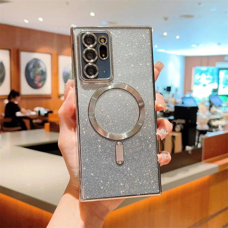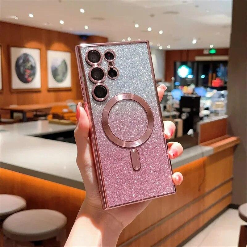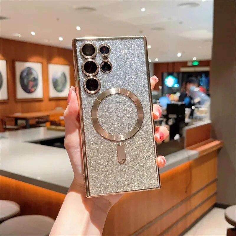 Для Samsung Galaxy S24 S23 S22 S21 S20 Plus Note 20 Ultra S20FE S21FE S23FE блестящий магнитный чехол Magsafe, мягкий блестящий женский чехол